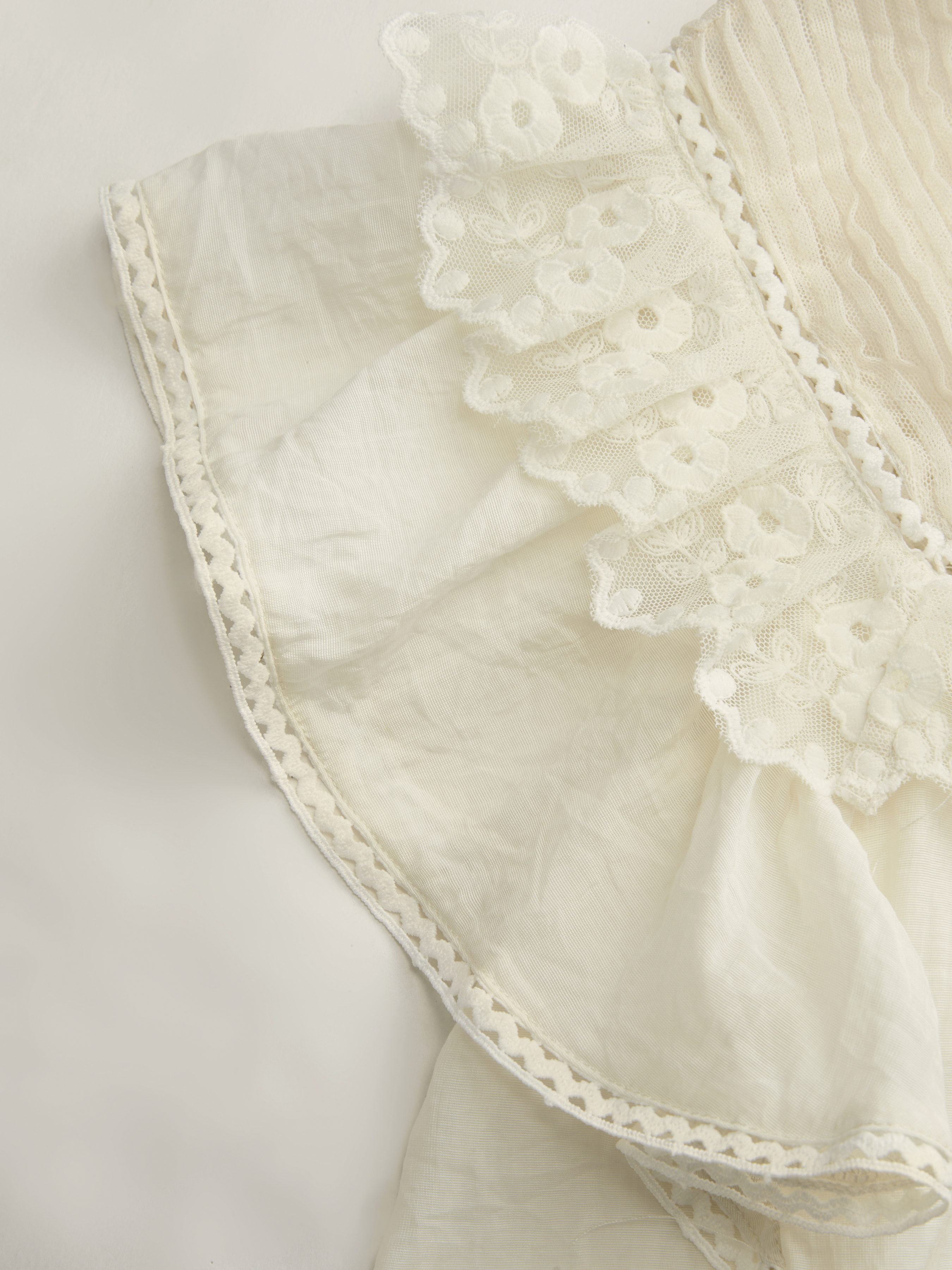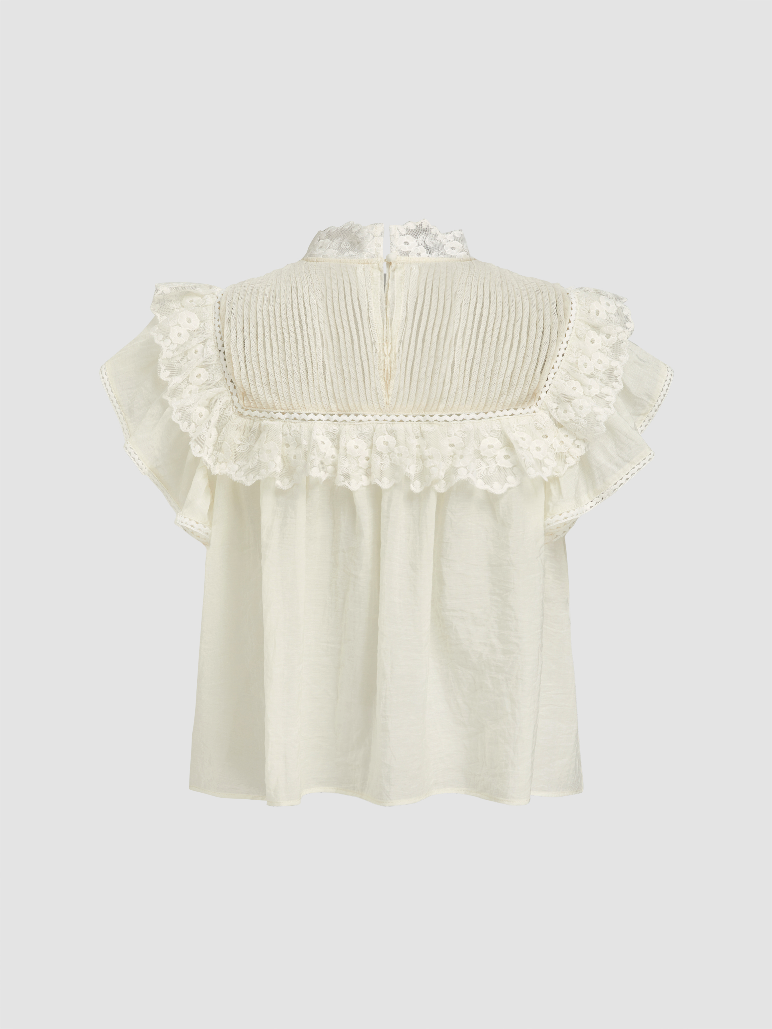 Camicetta oversize con colletto alla coreana, rifiniture in pizzo e volant