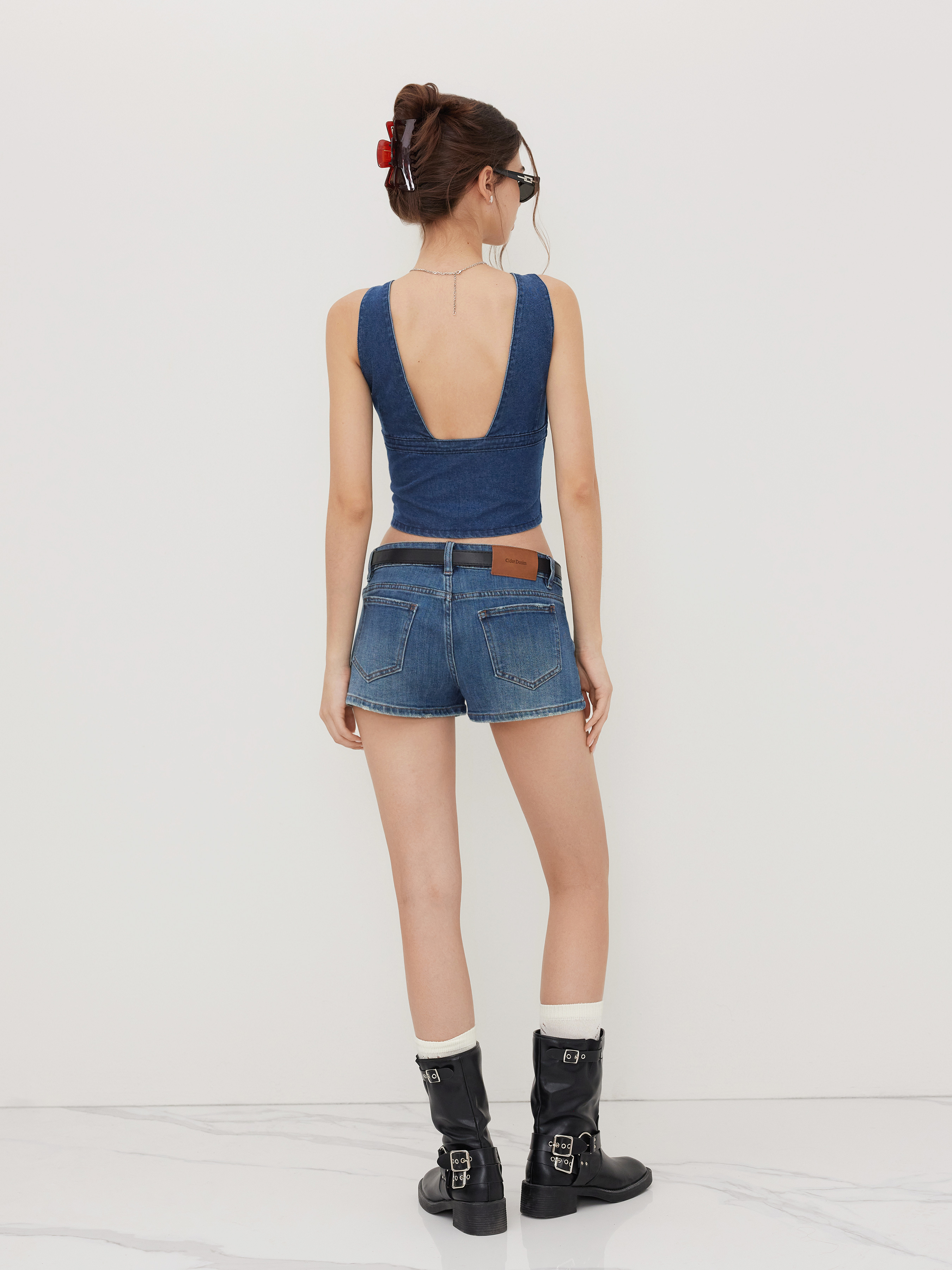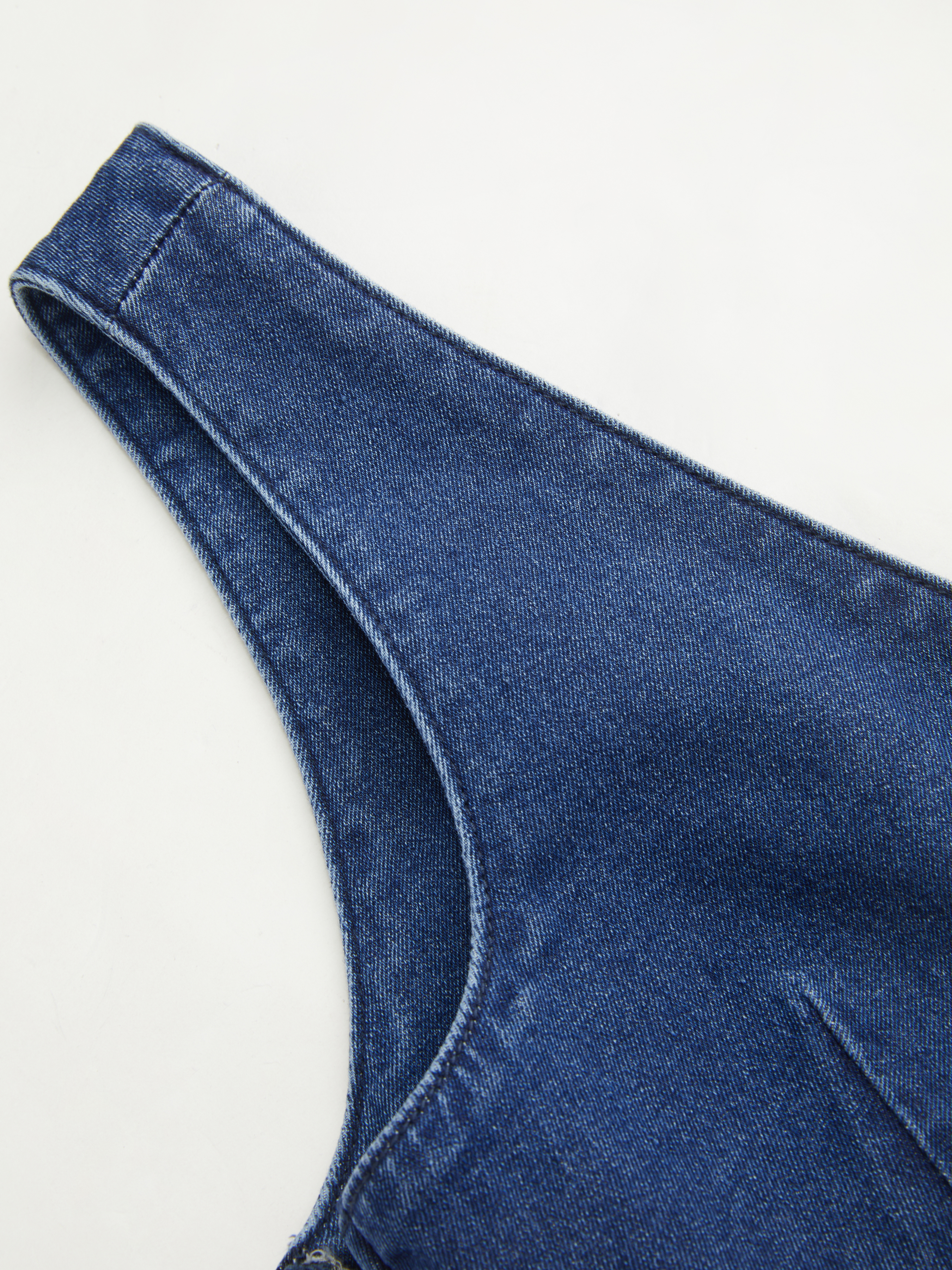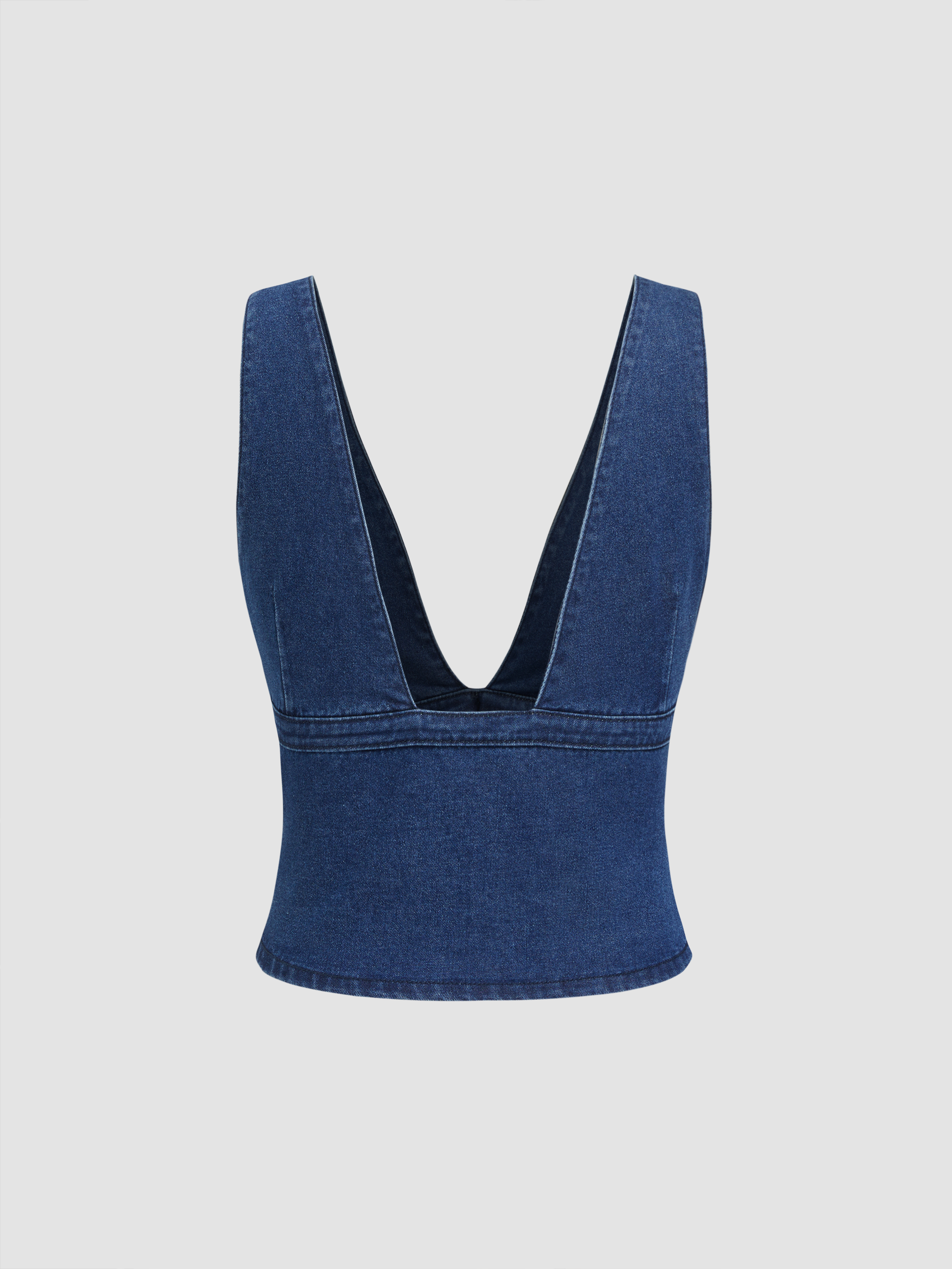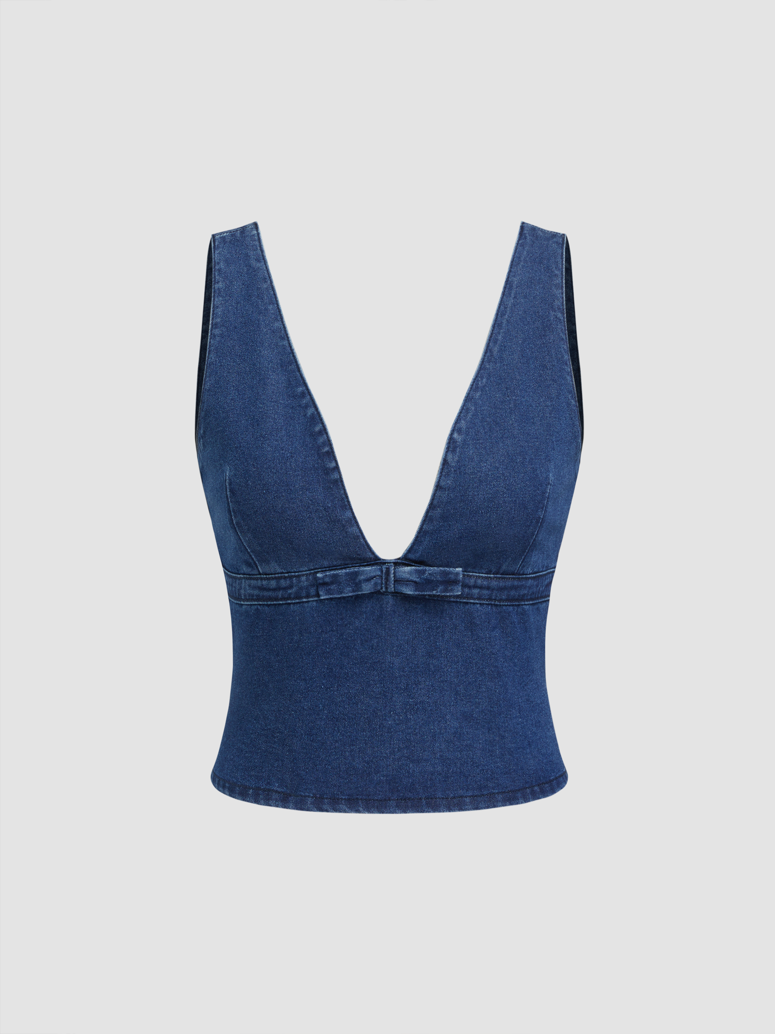 Canotta in denim elasticizzato con scollo a V e fiocco