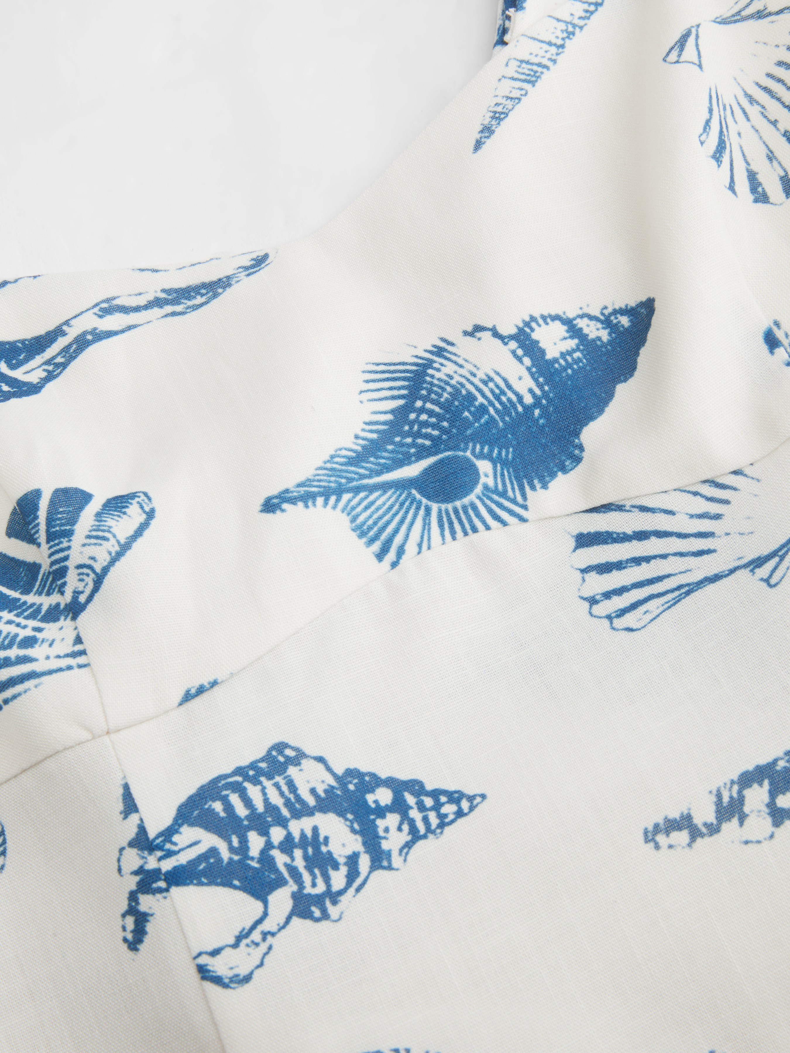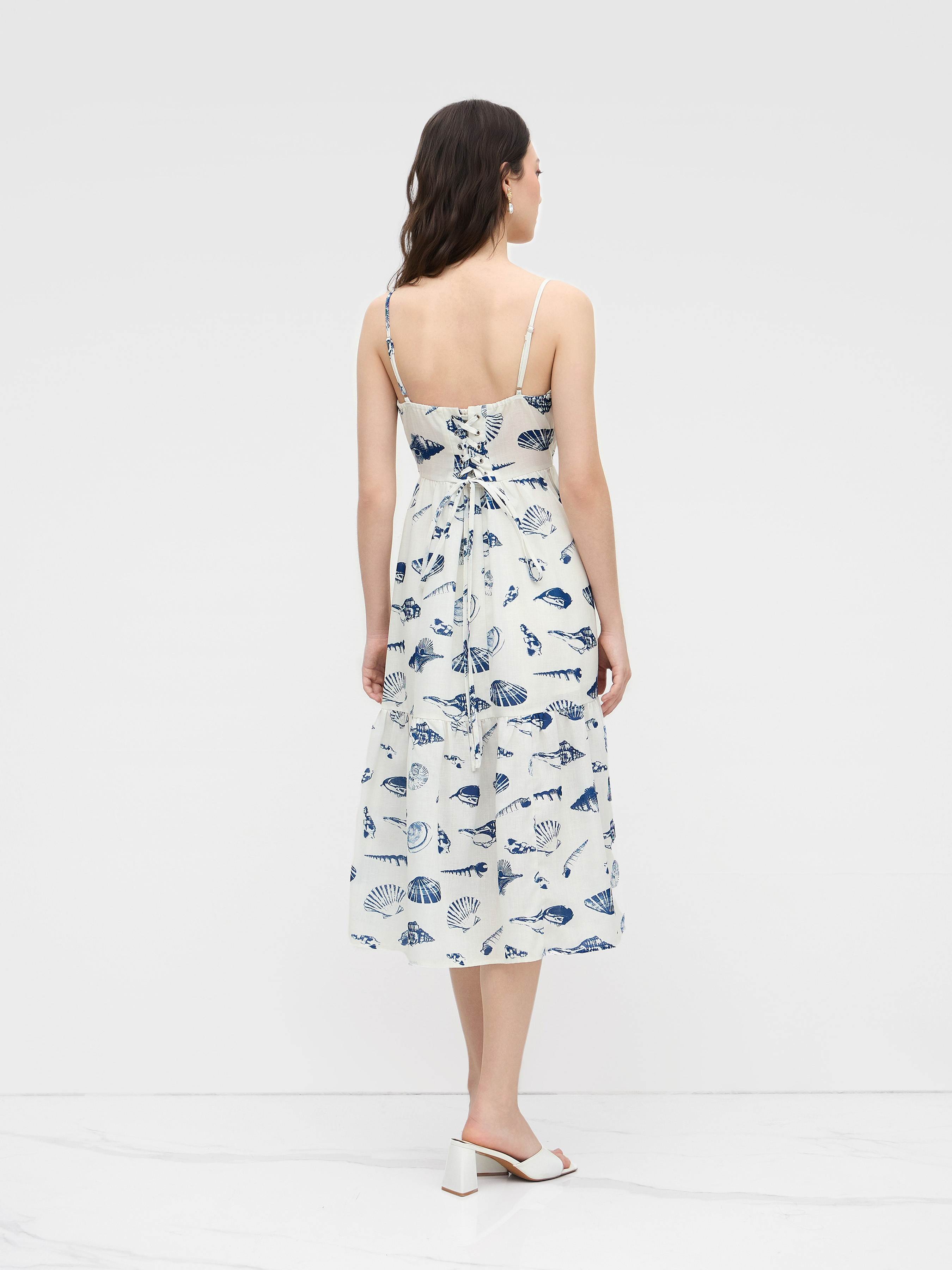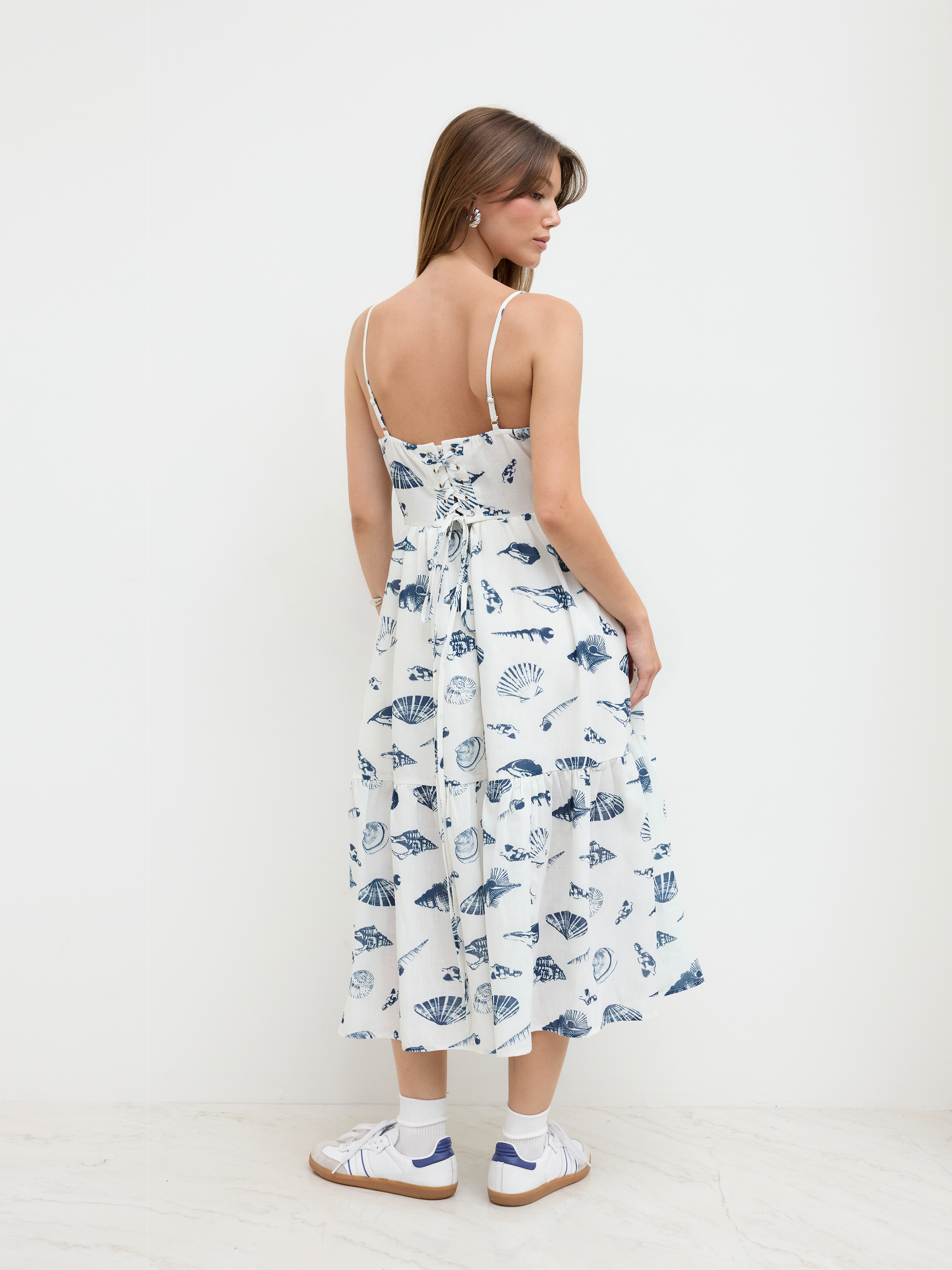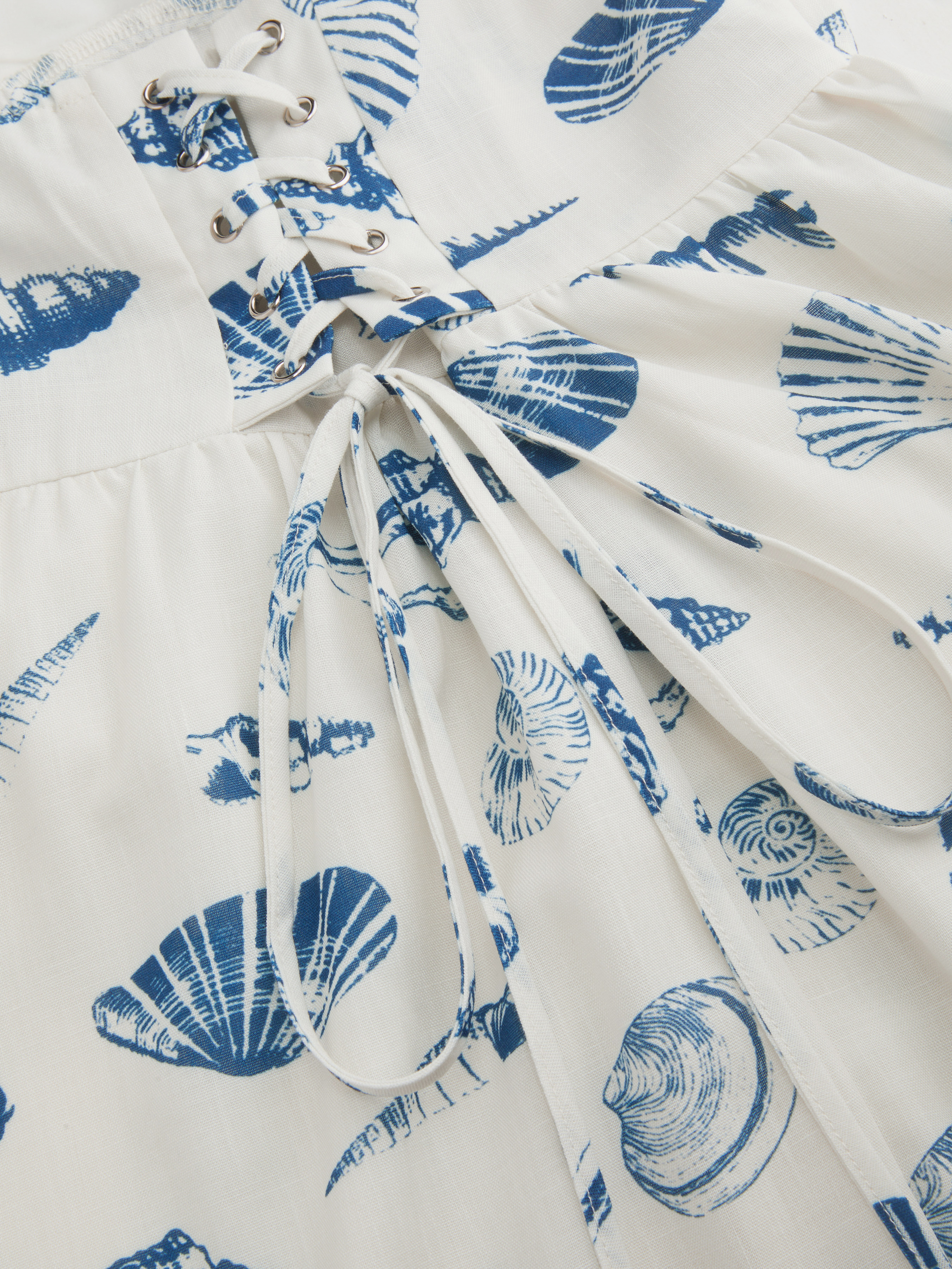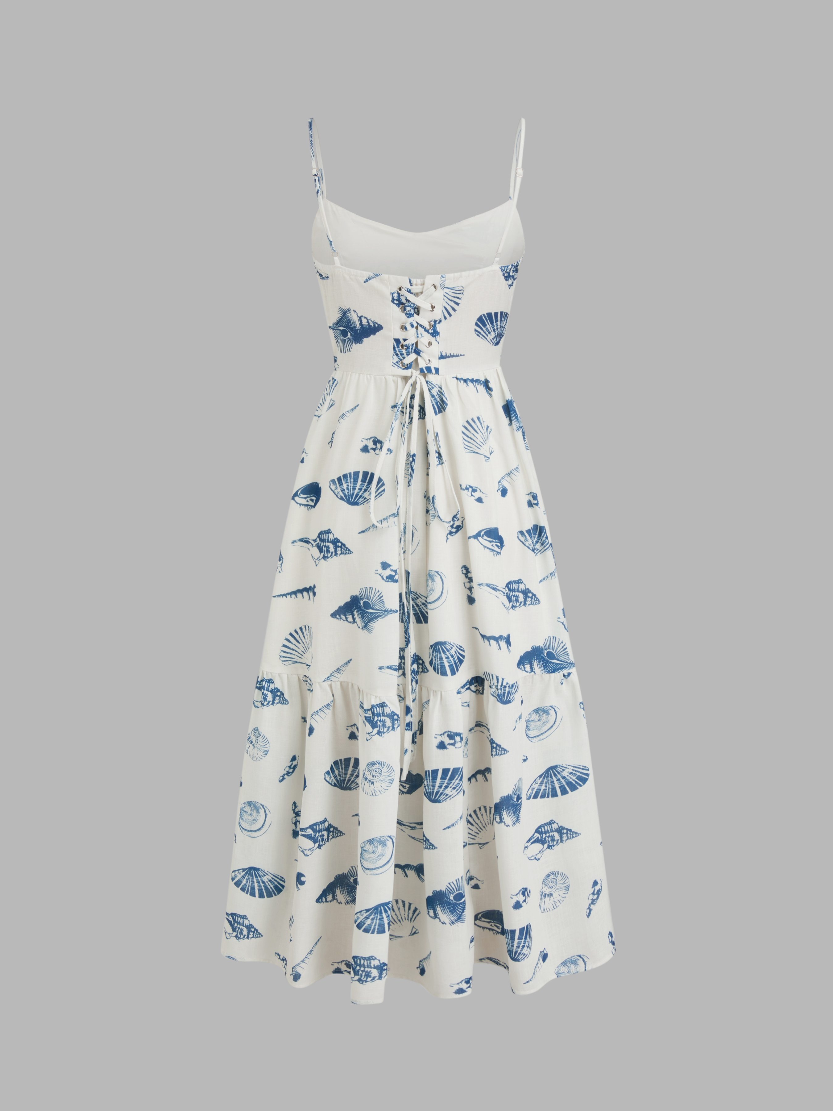Abito Midi con Scollo a Cuore, Motivo di Frutti di Mare, Volant e Allacciatura