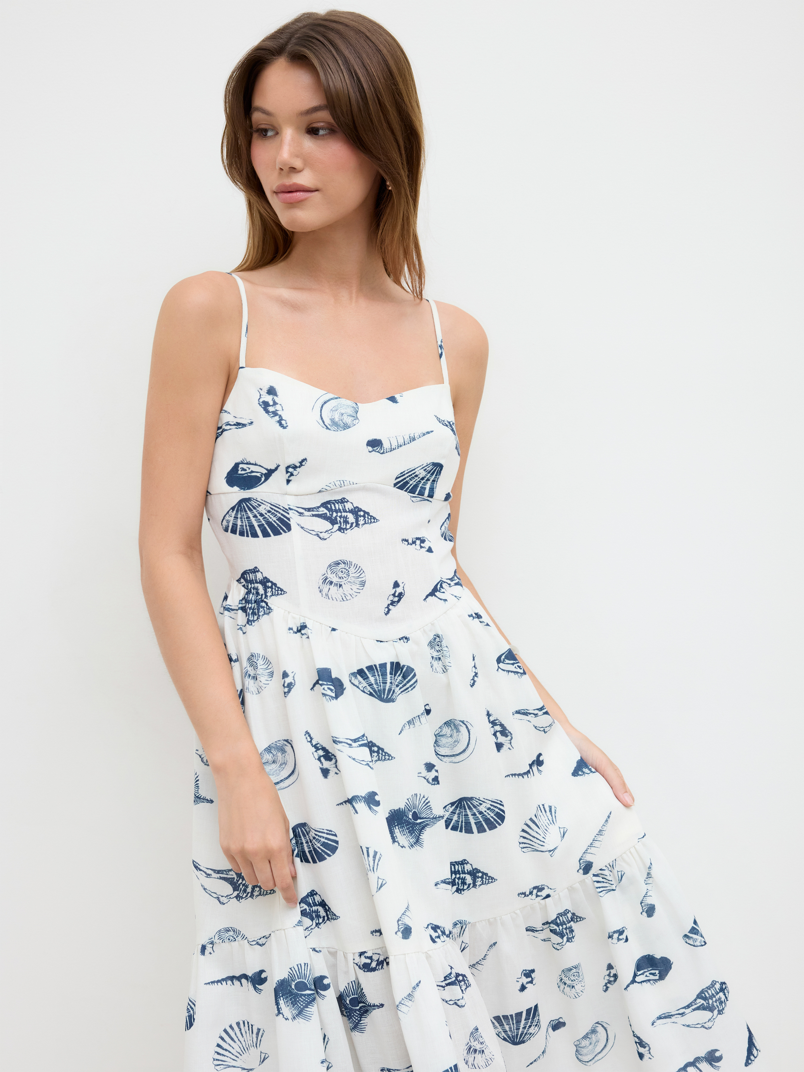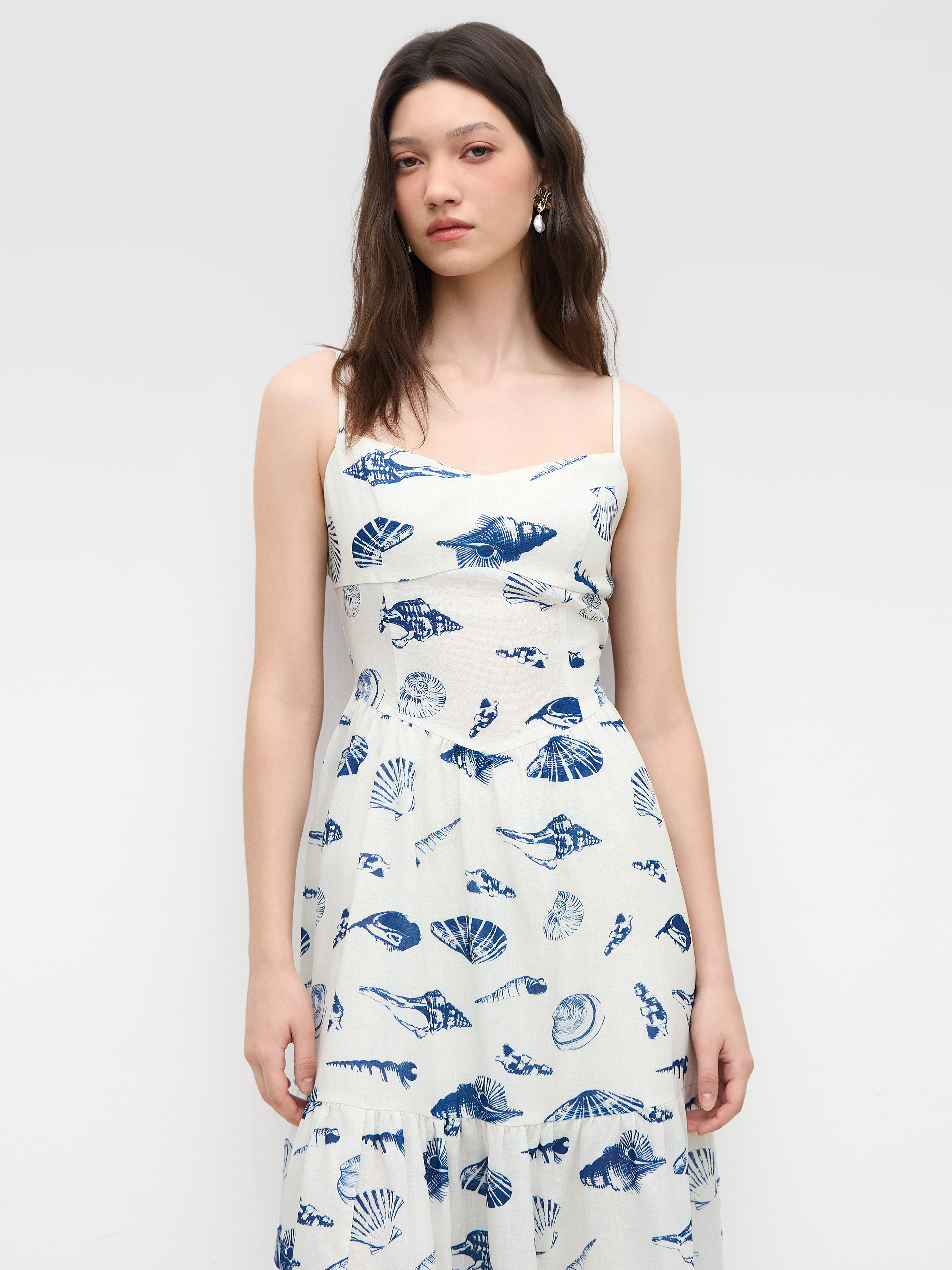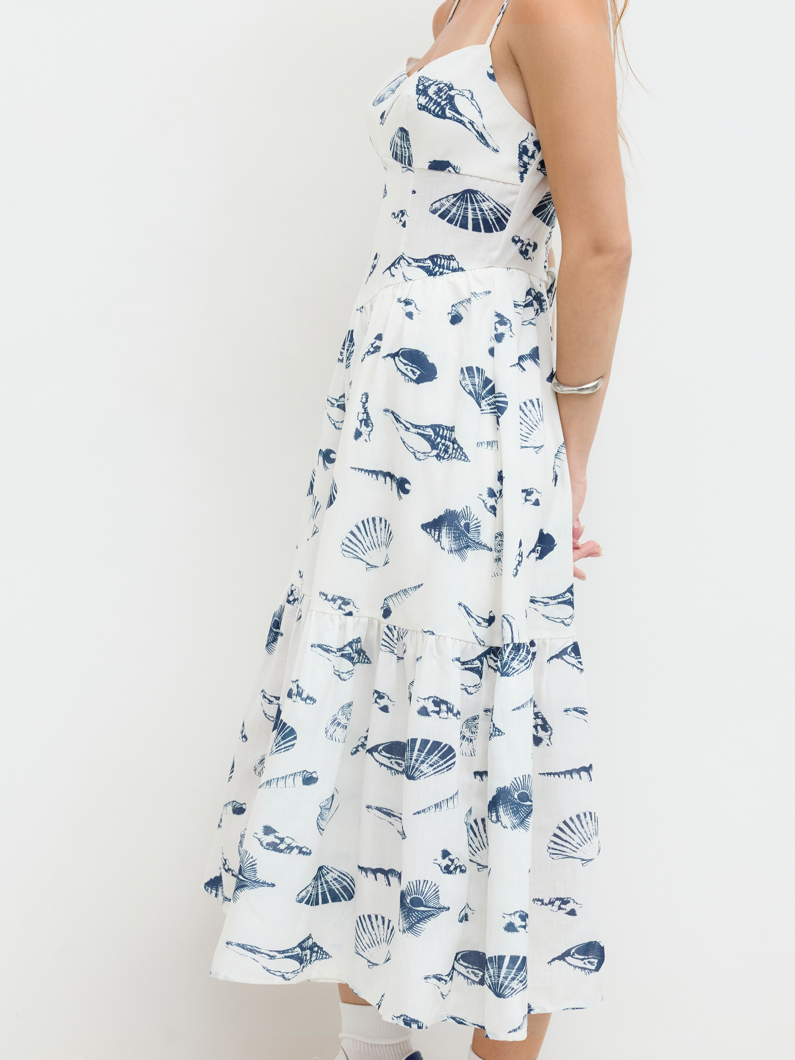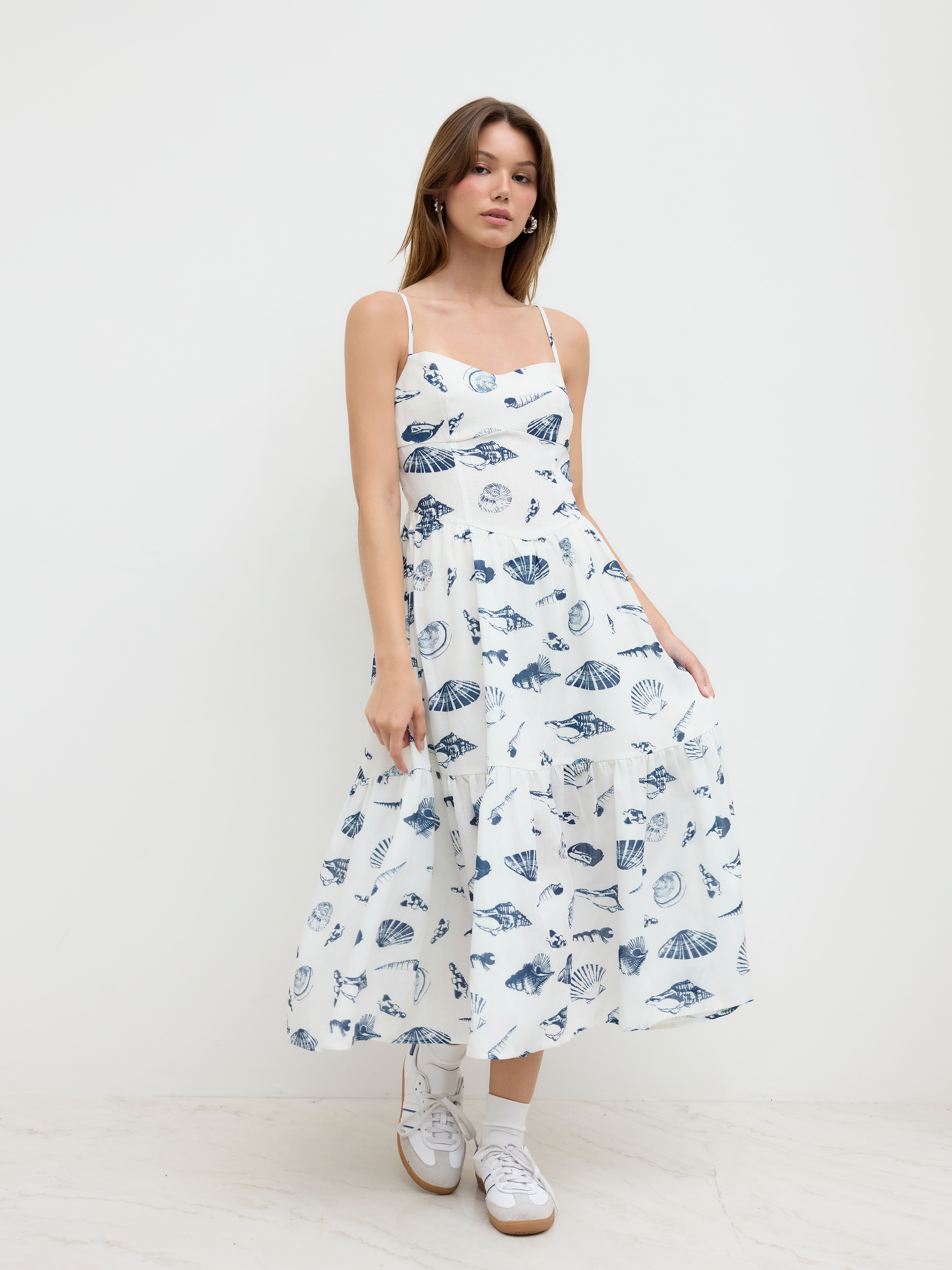 Abito Midi con Scollo a Cuore, Motivo di Frutti di Mare, Volant e Allacciatura
