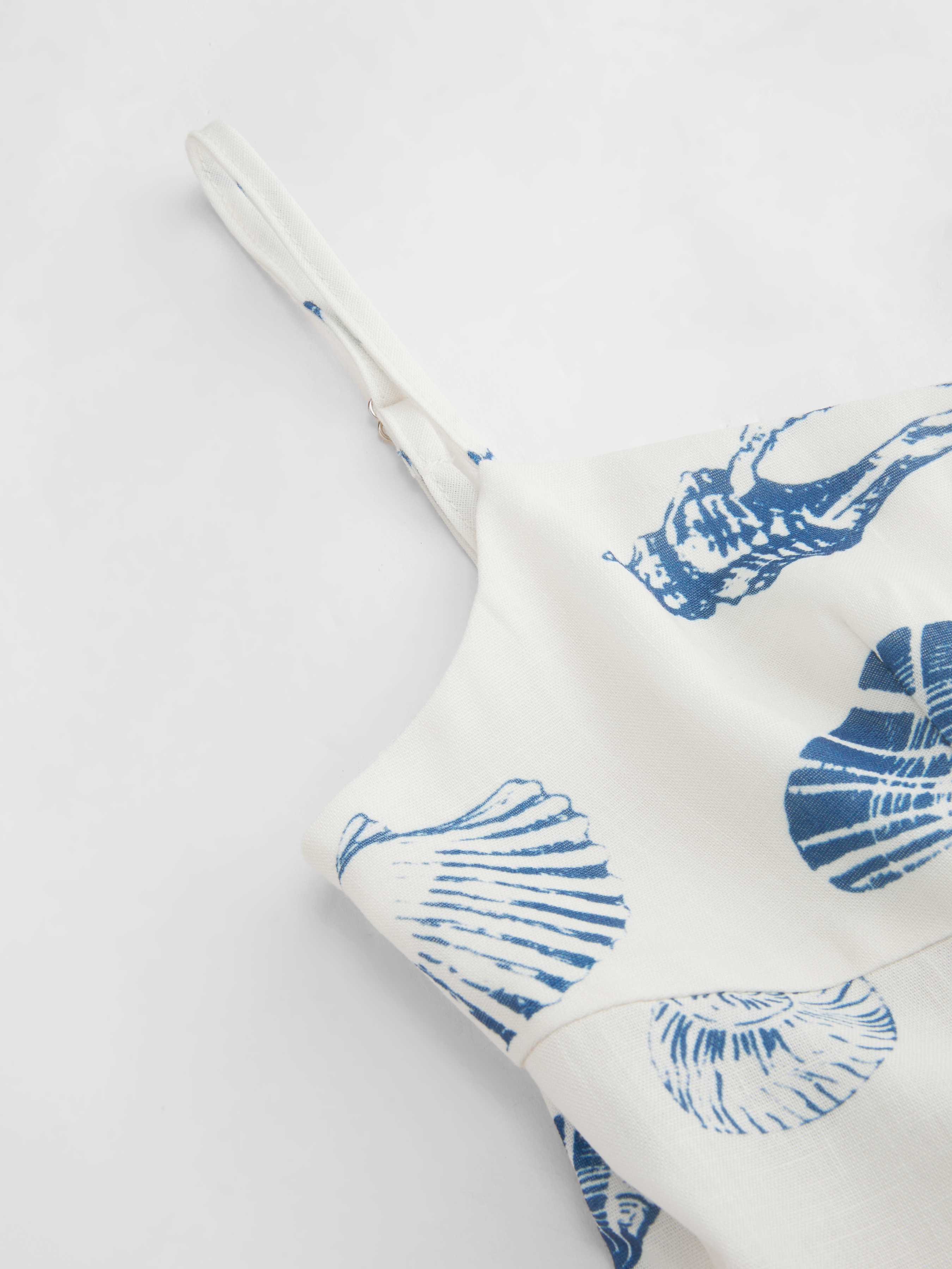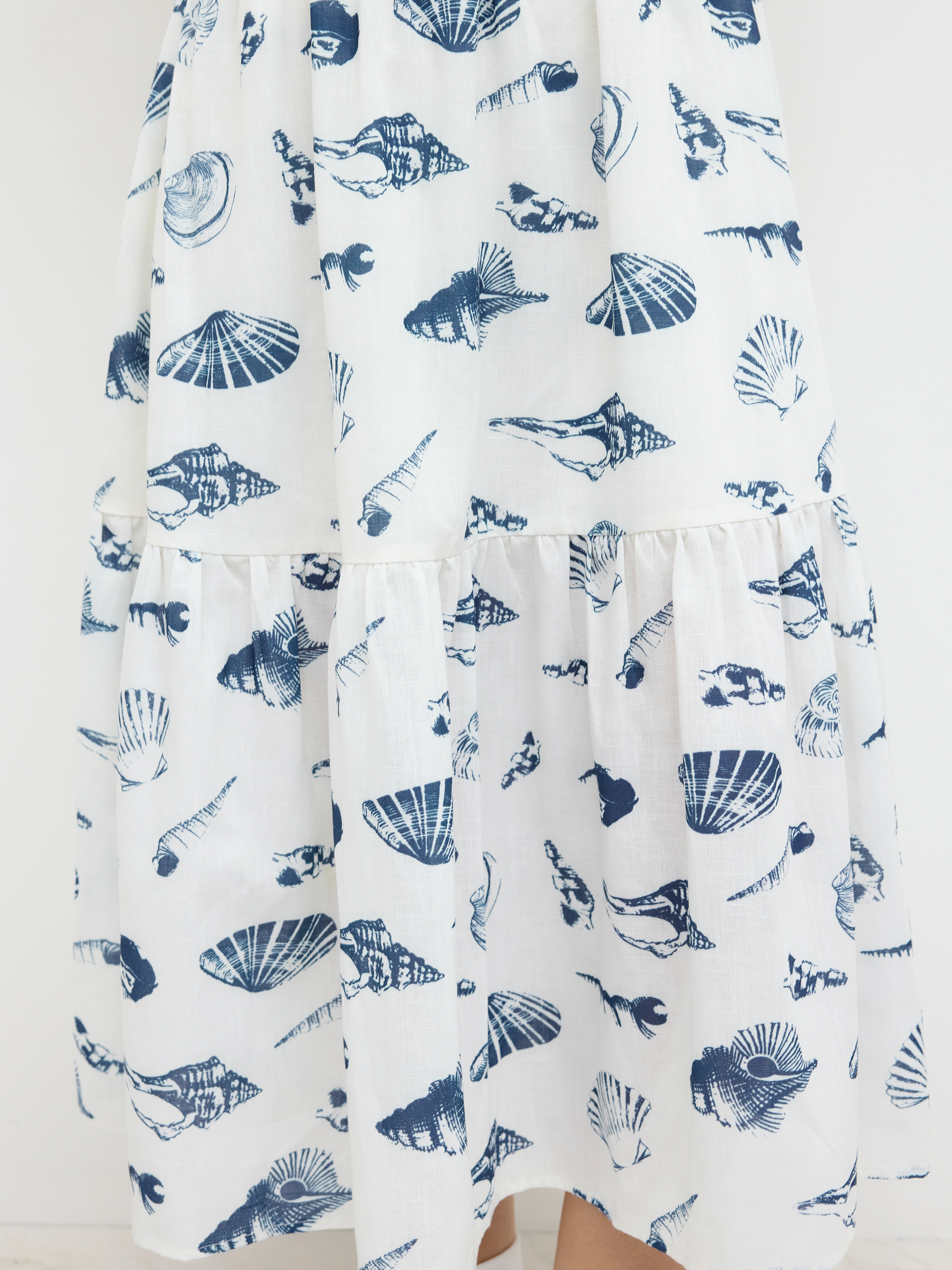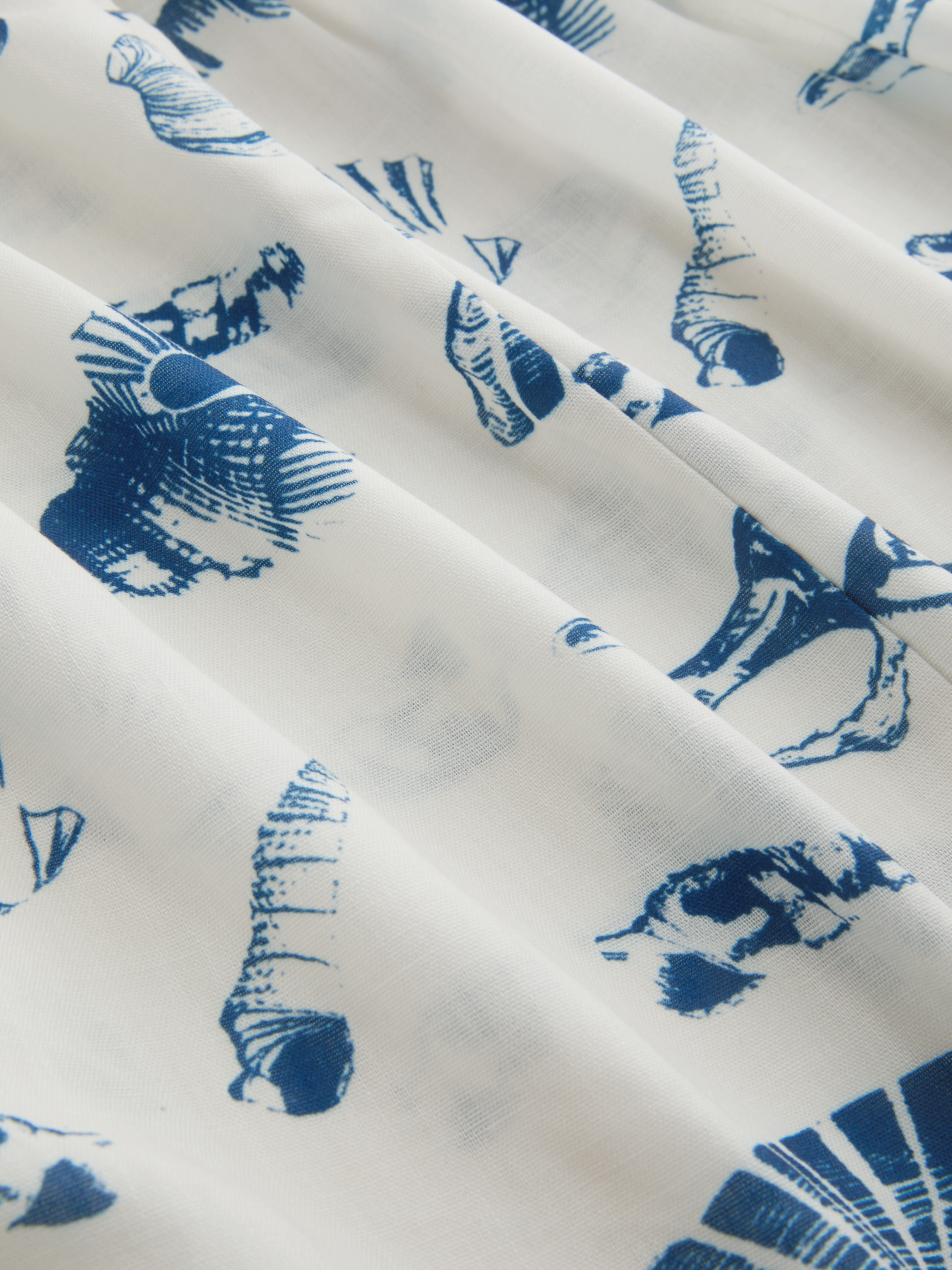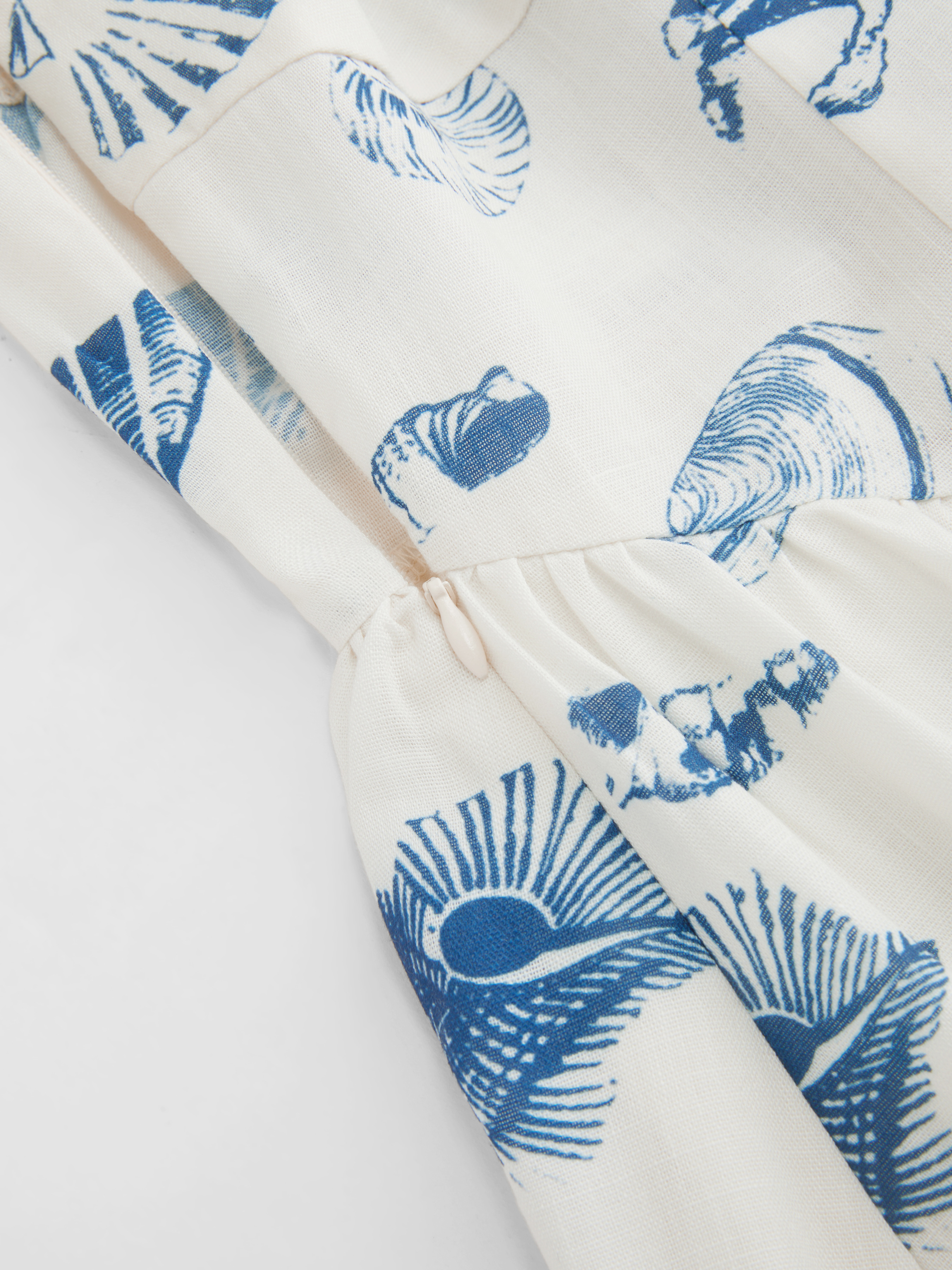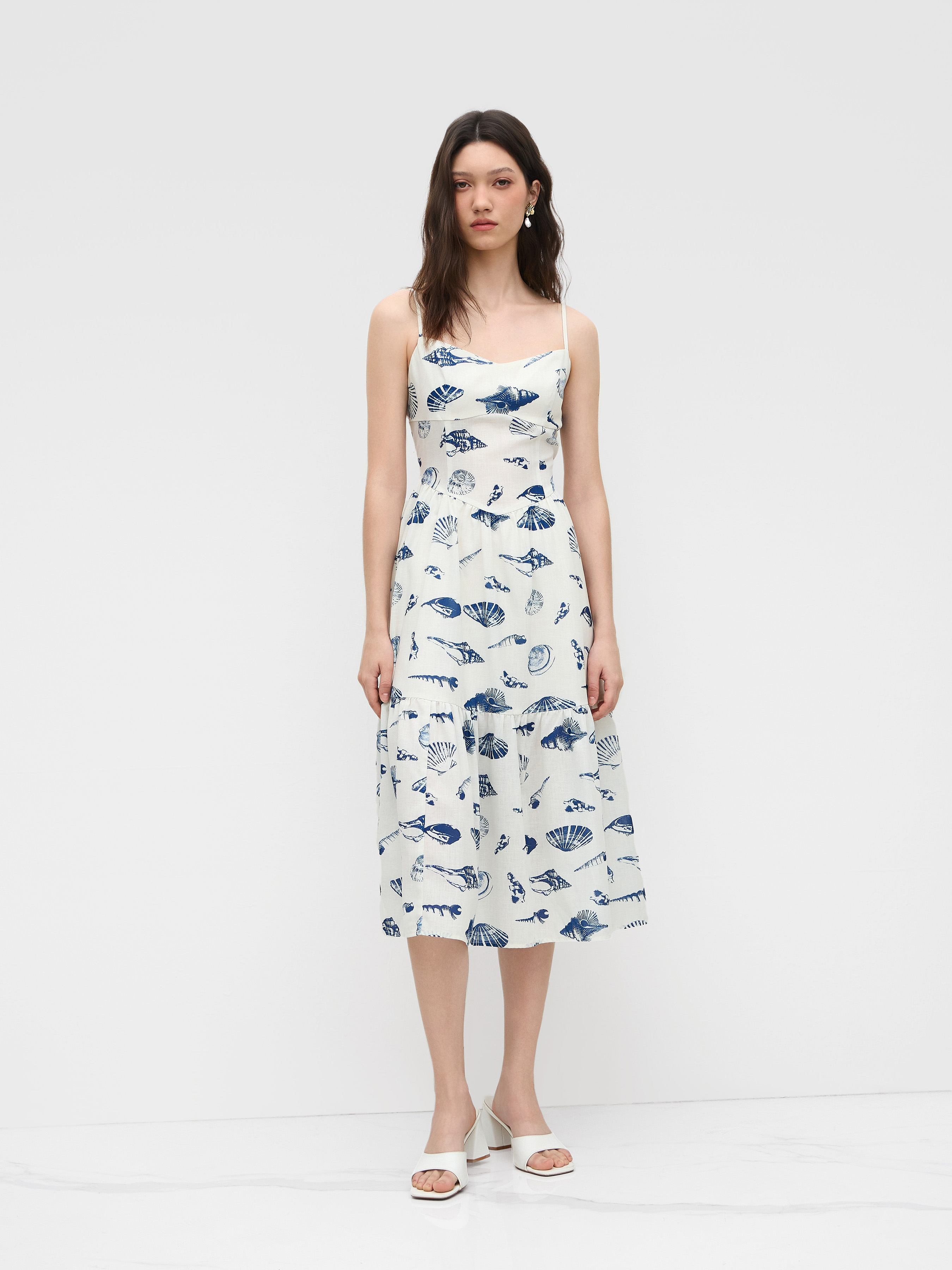 Abito Midi con Scollo a Cuore, Motivo di Frutti di Mare, Volant e Allacciatura