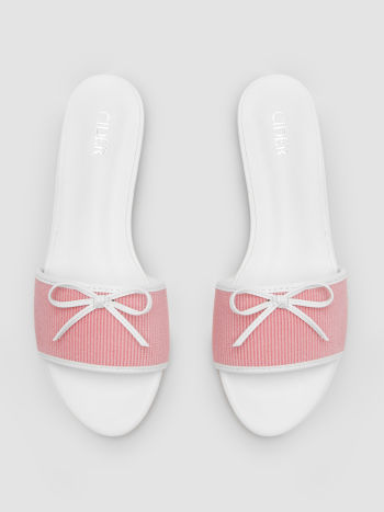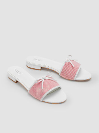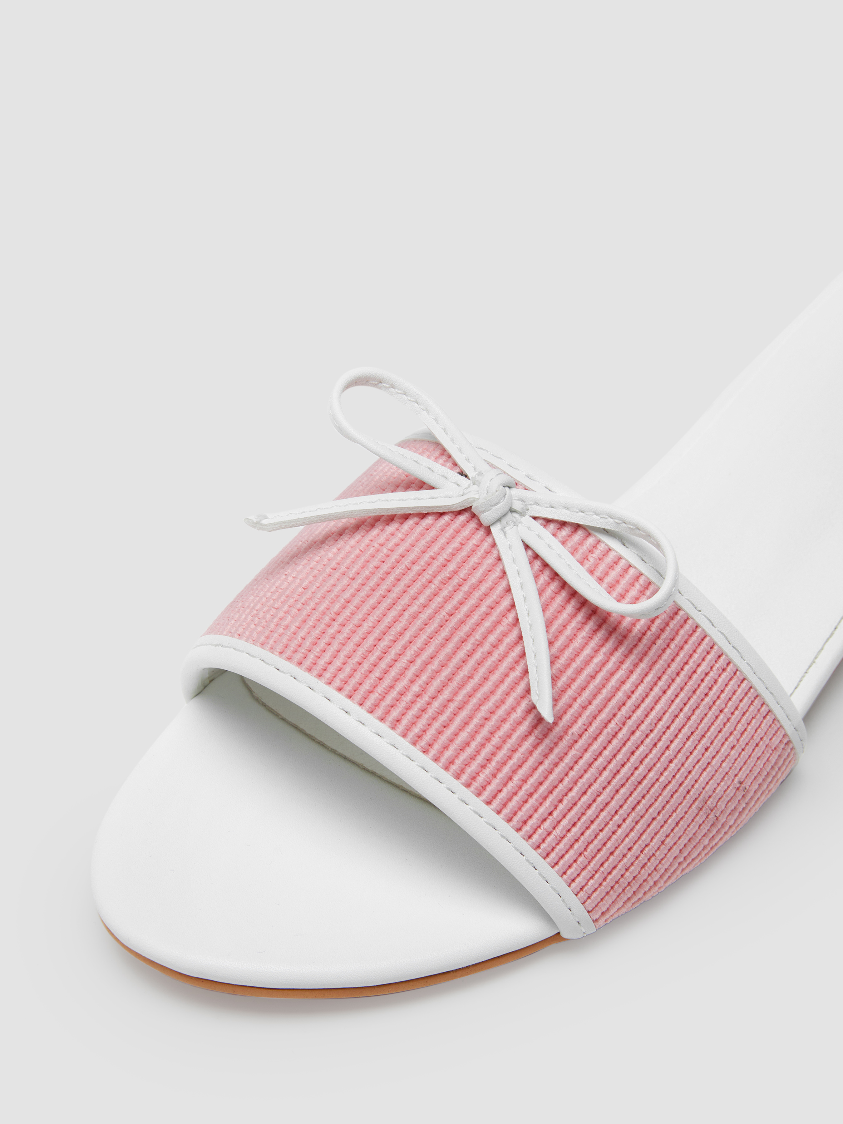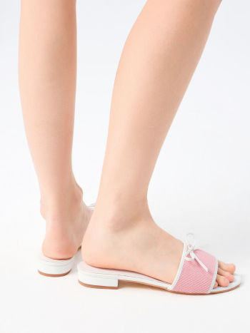 SLIPPERS IN MAGLIA E SIMILPELLE CON FIOCCO BICOLORE E TACCO BASSO