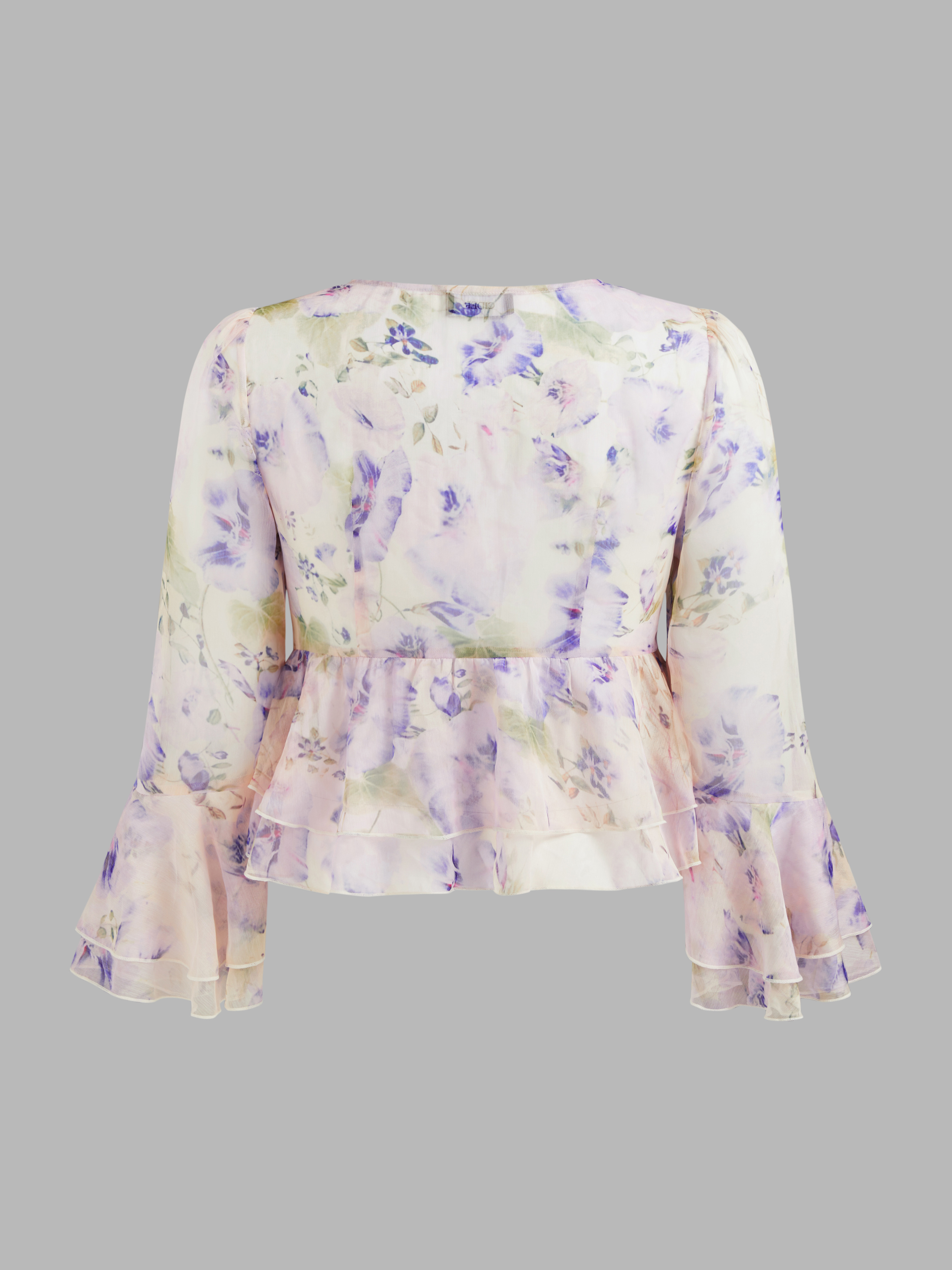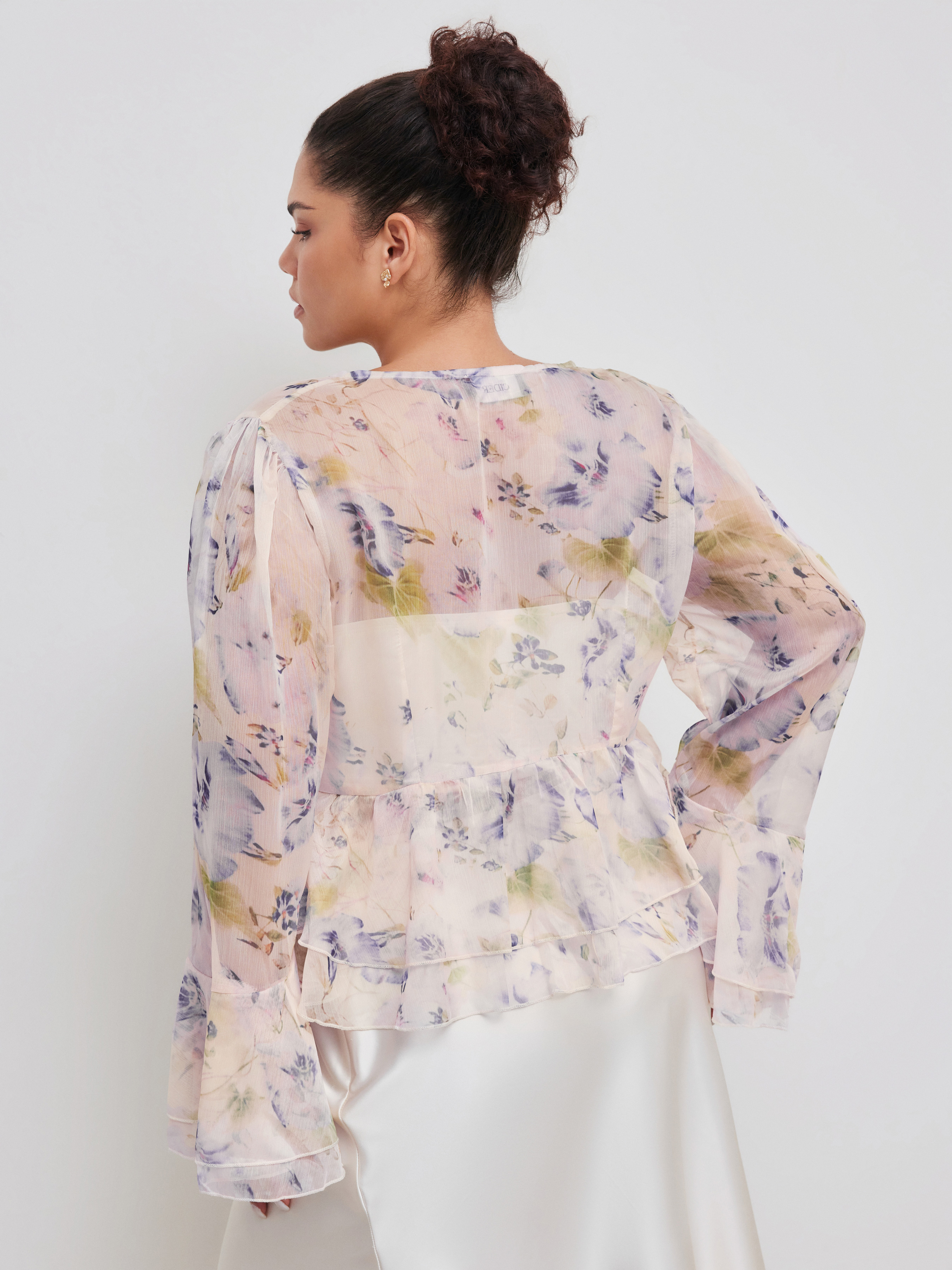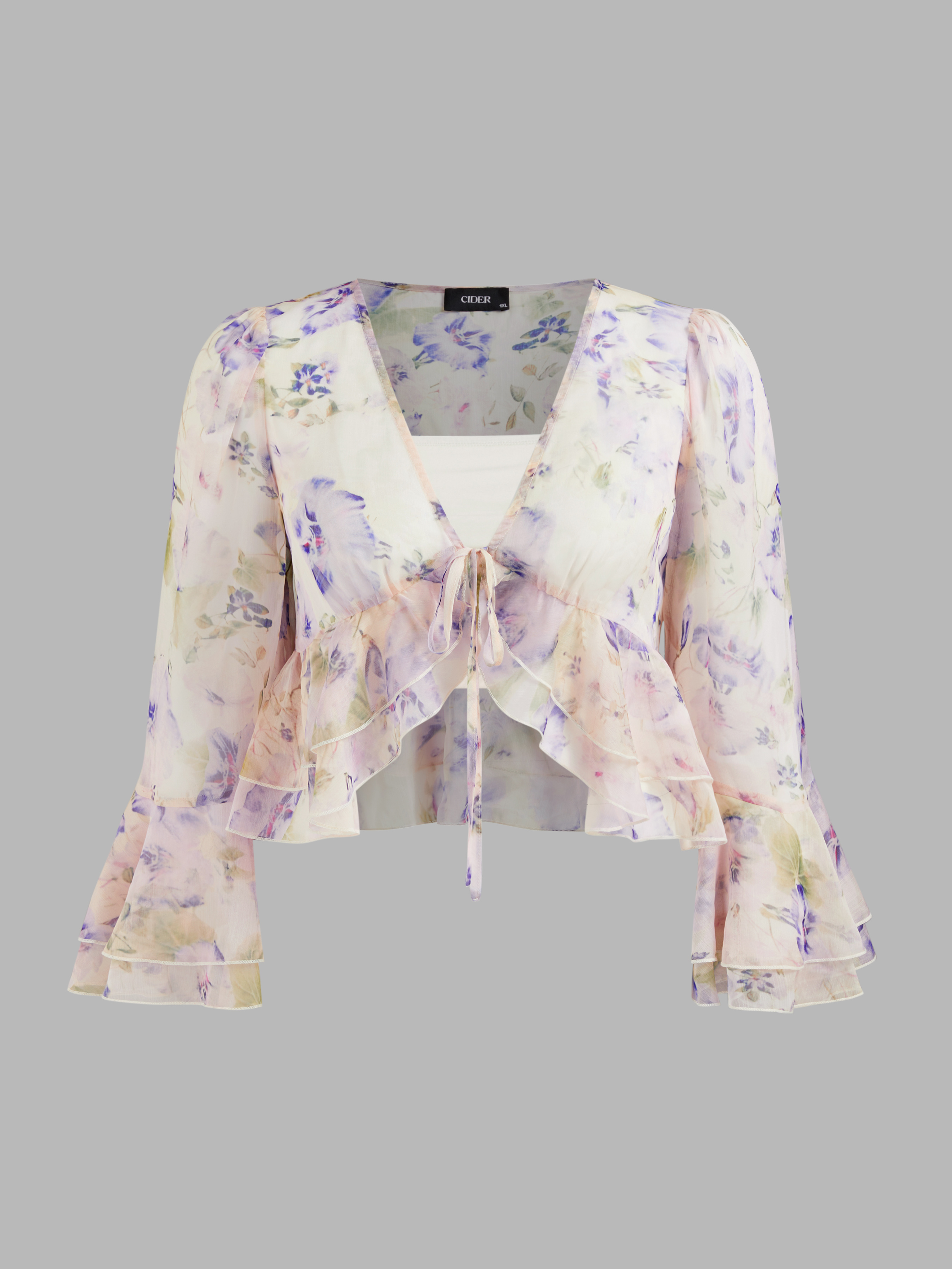 Camicetta a maniche lunghe con scollo a V con nodo floreale e orlo increspato, con top a tubo tinta unita Curve & Plus