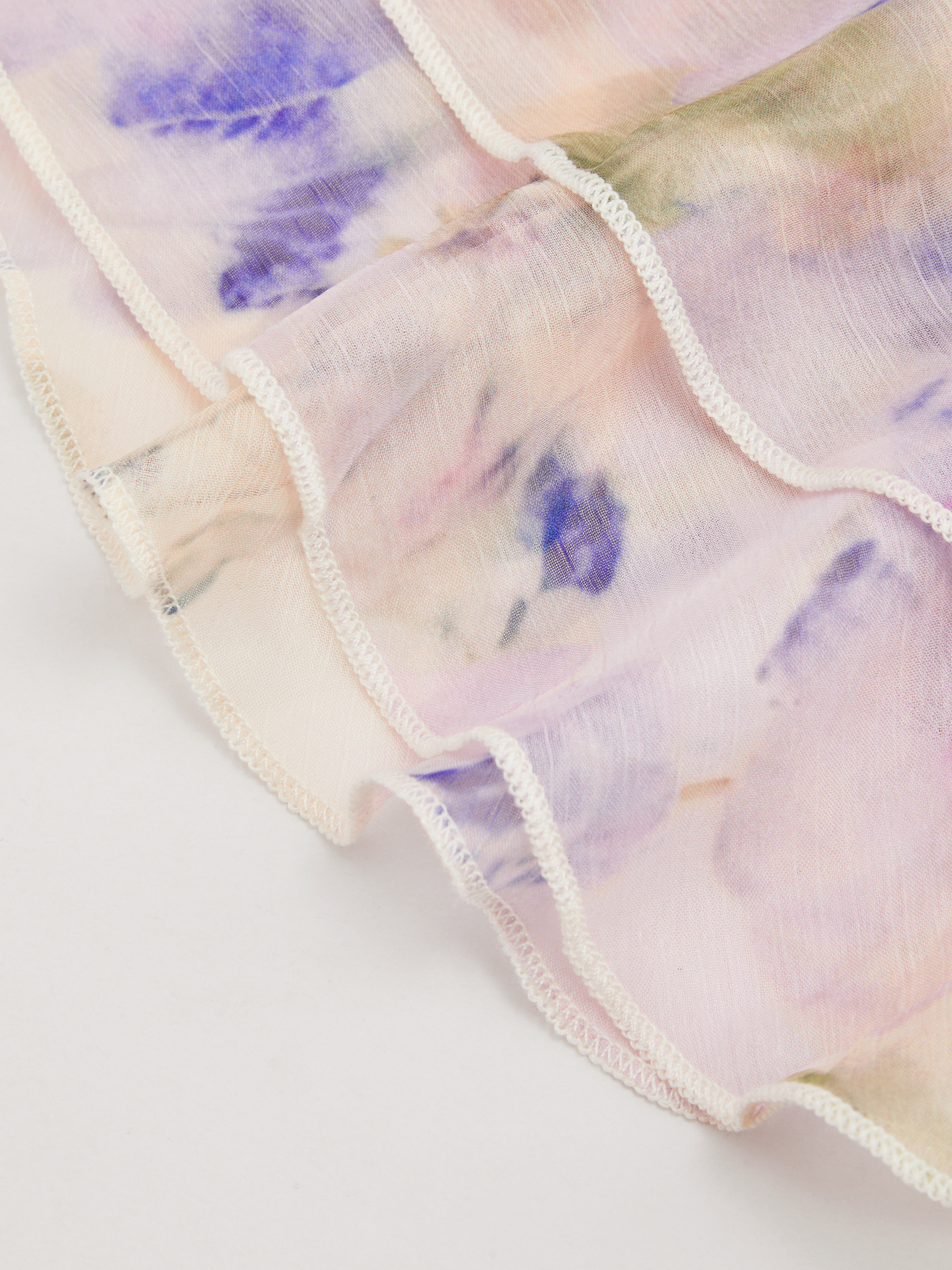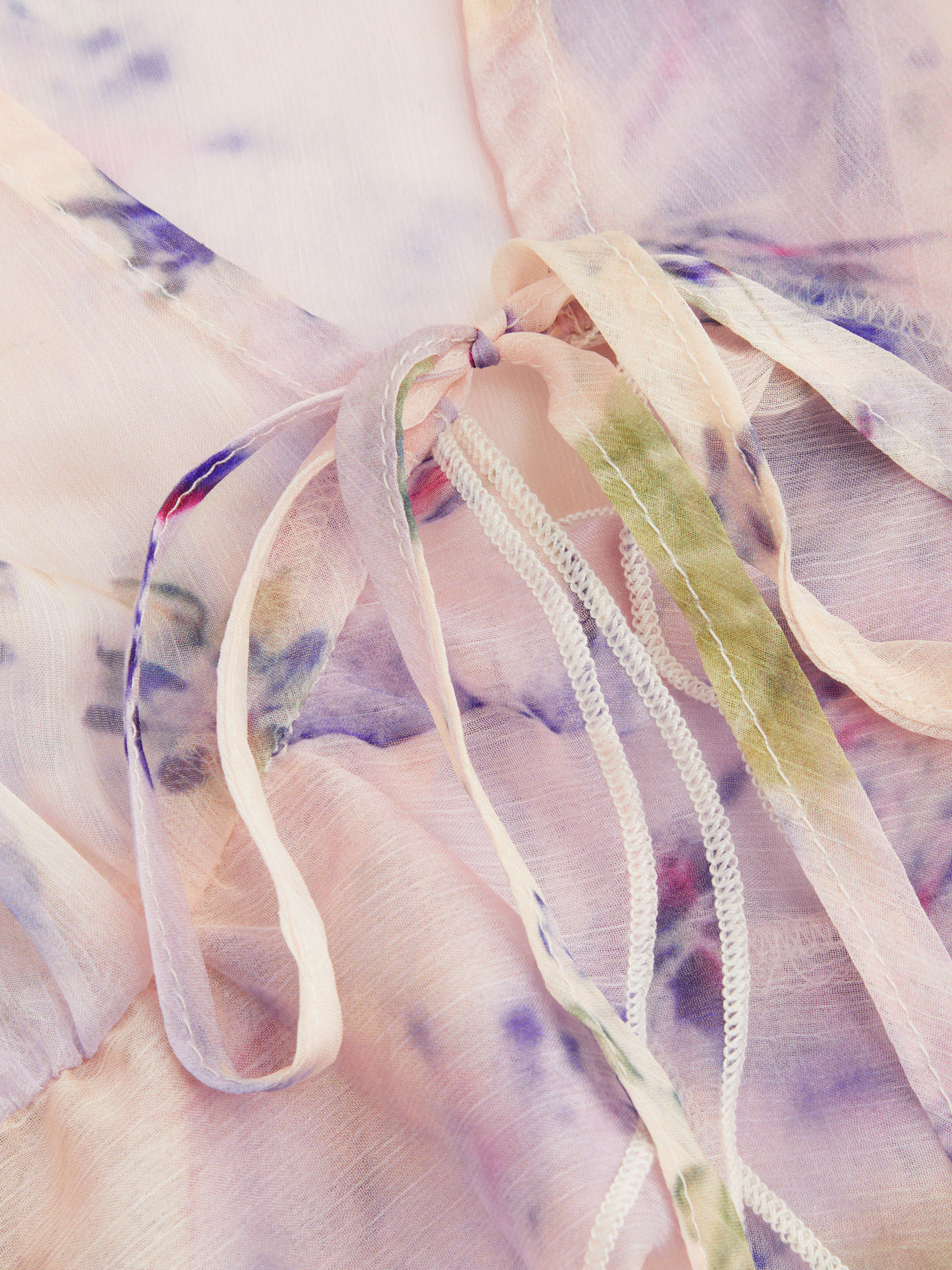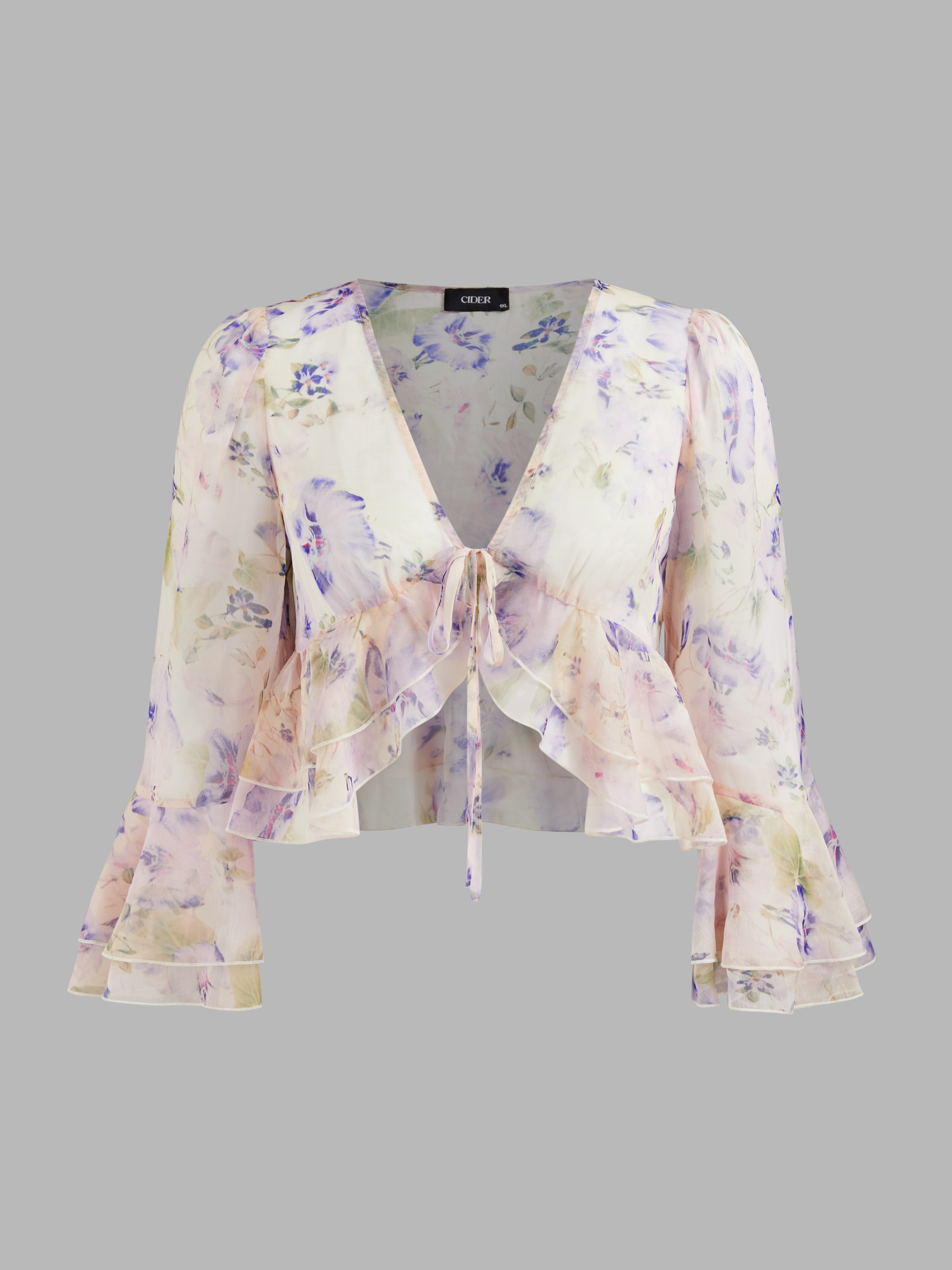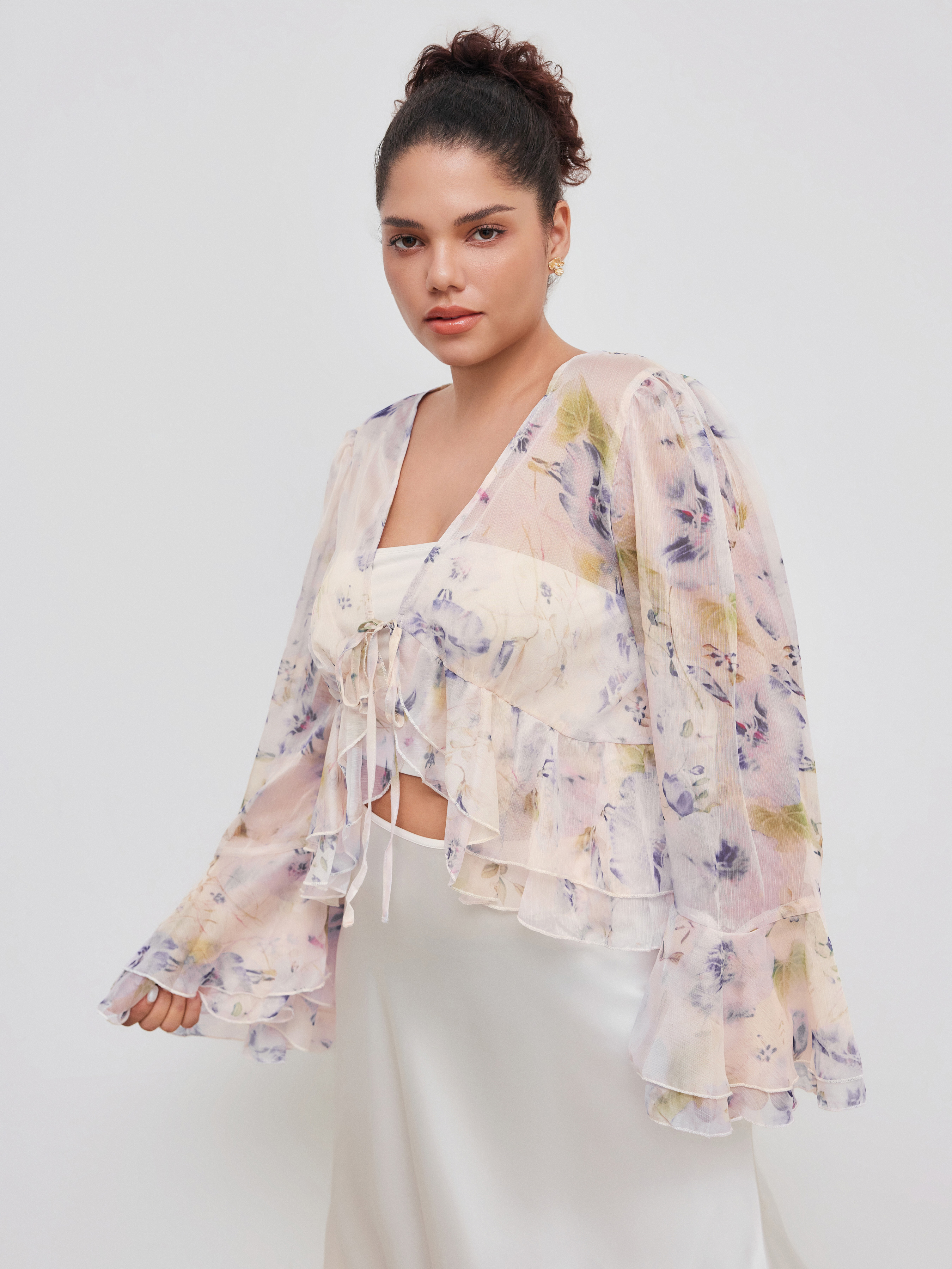 Camicetta a maniche lunghe con scollo a V con nodo floreale e orlo increspato, con top a tubo tinta unita Curve & Plus