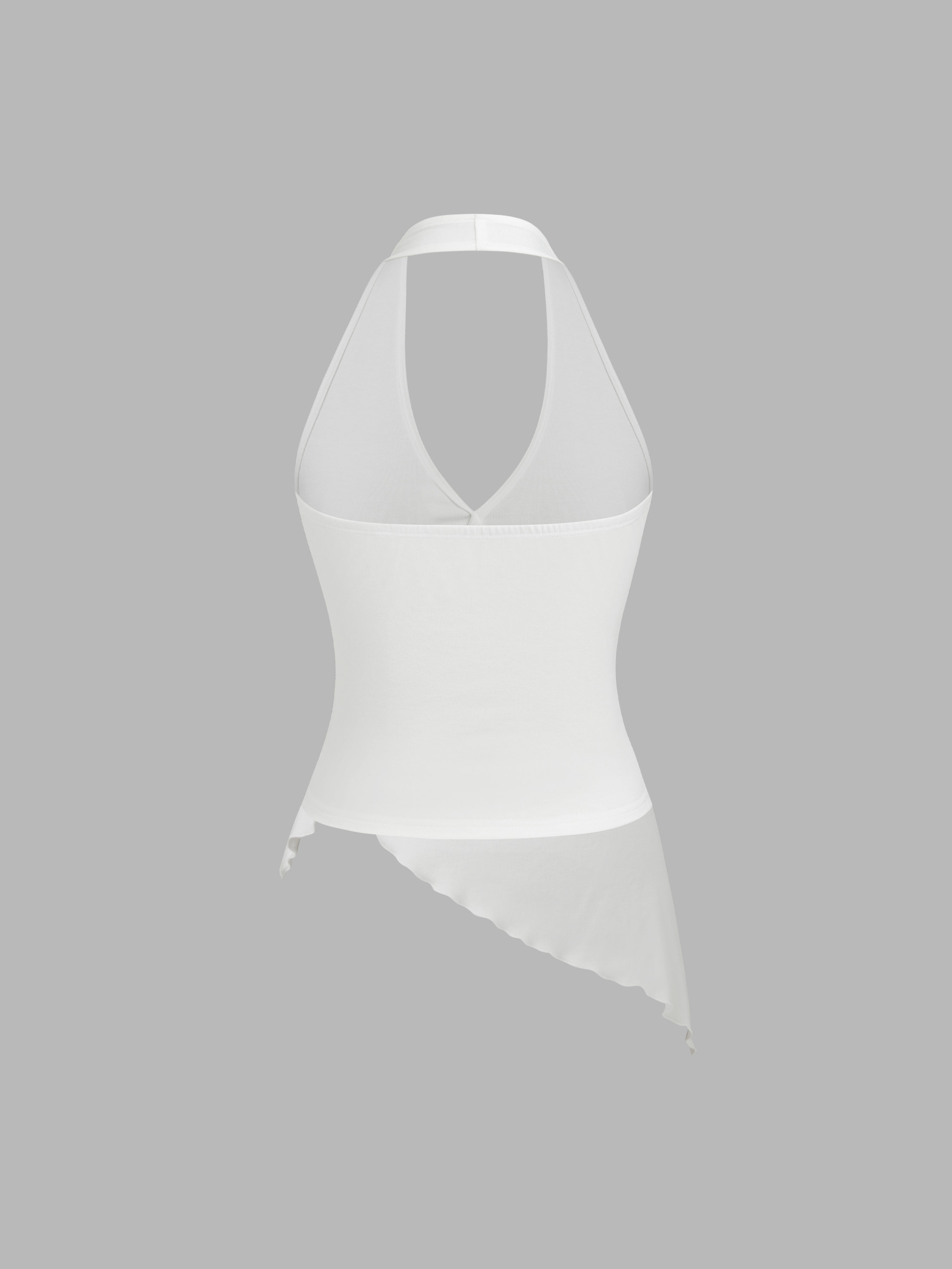Canotta con scollo a V, allacciata al collo, con fibbia, bordo a lattuga e orlo asimmetrico