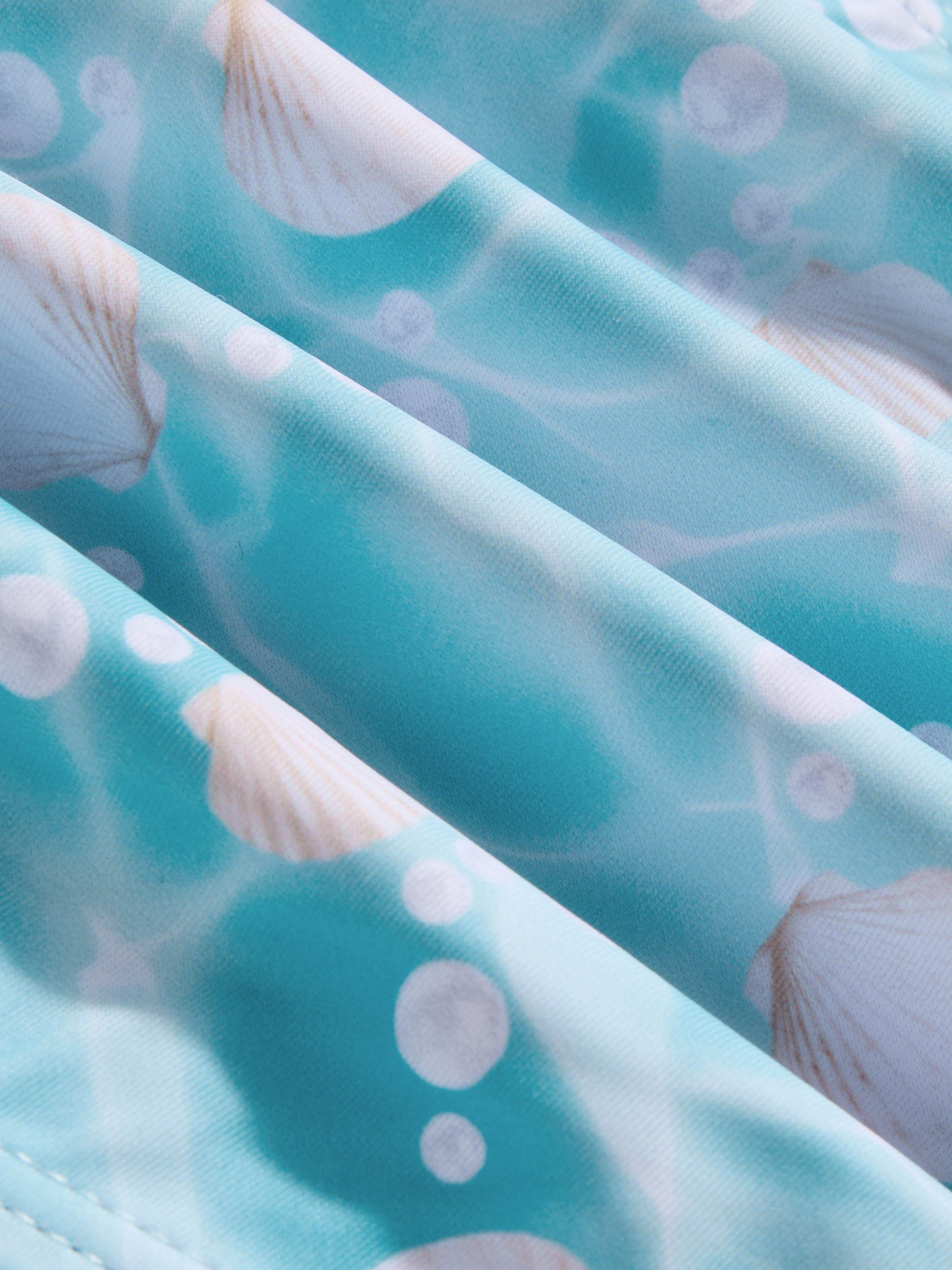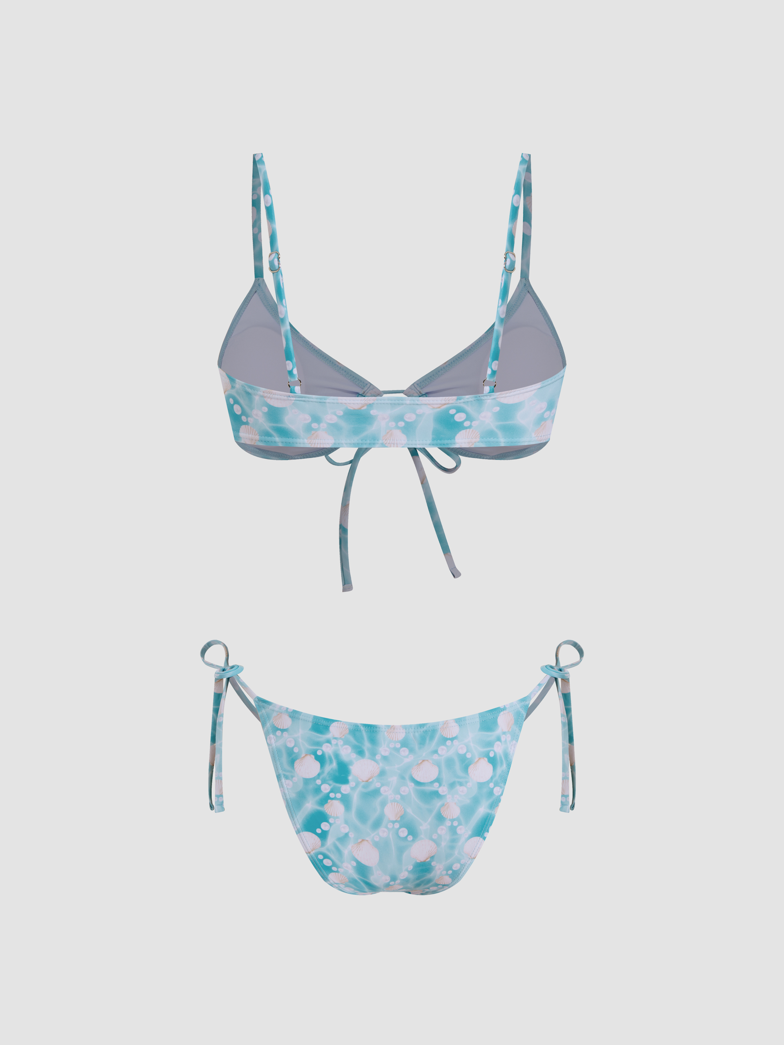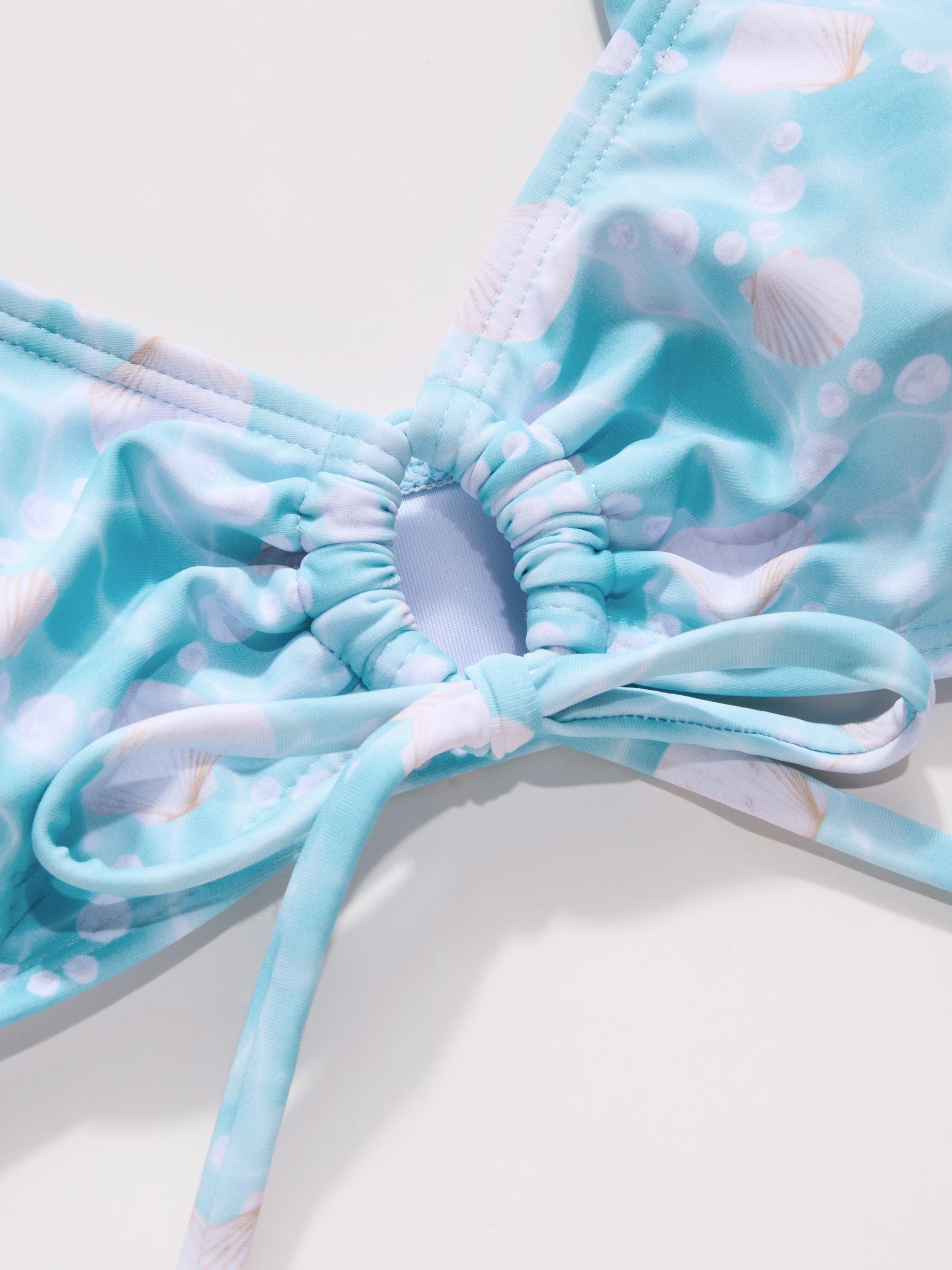 Set bikini con scollo a V con perle e conchiglie intagliate, braccialetto annodato e lacci laterali