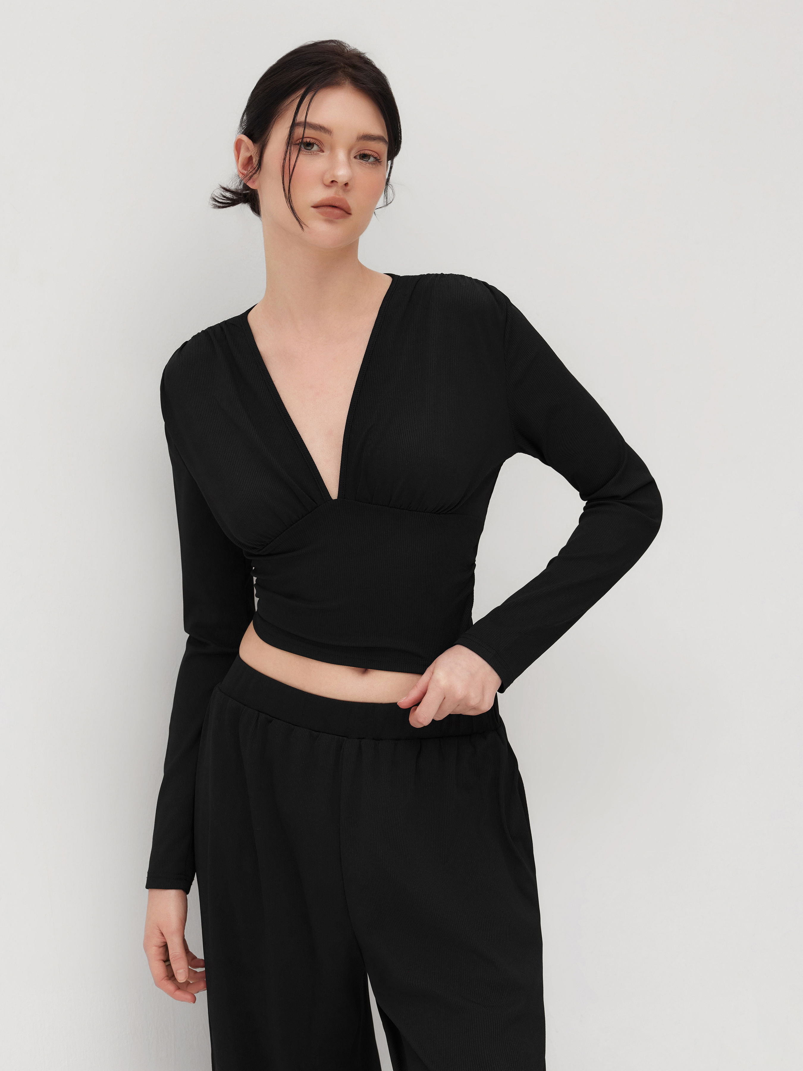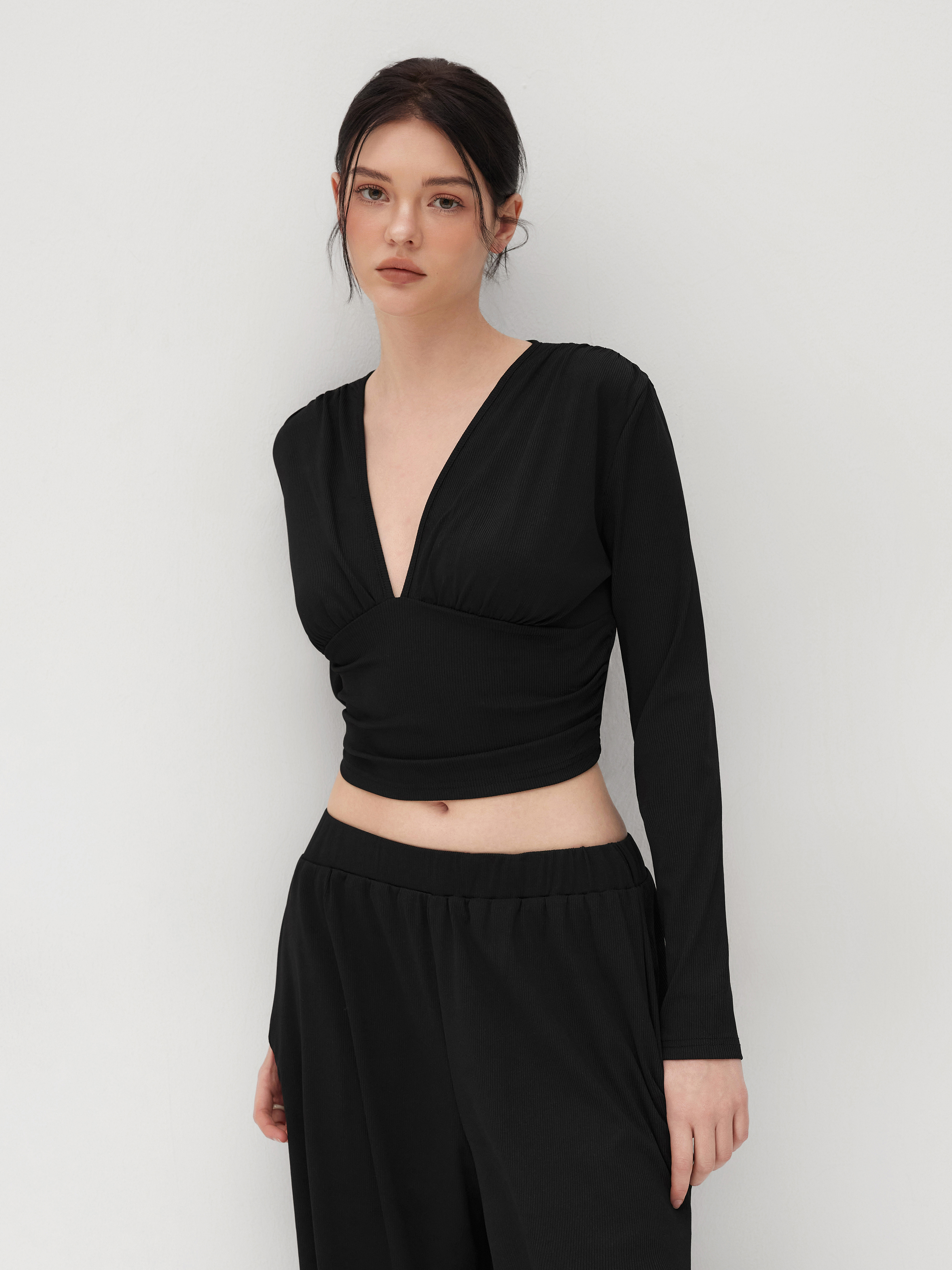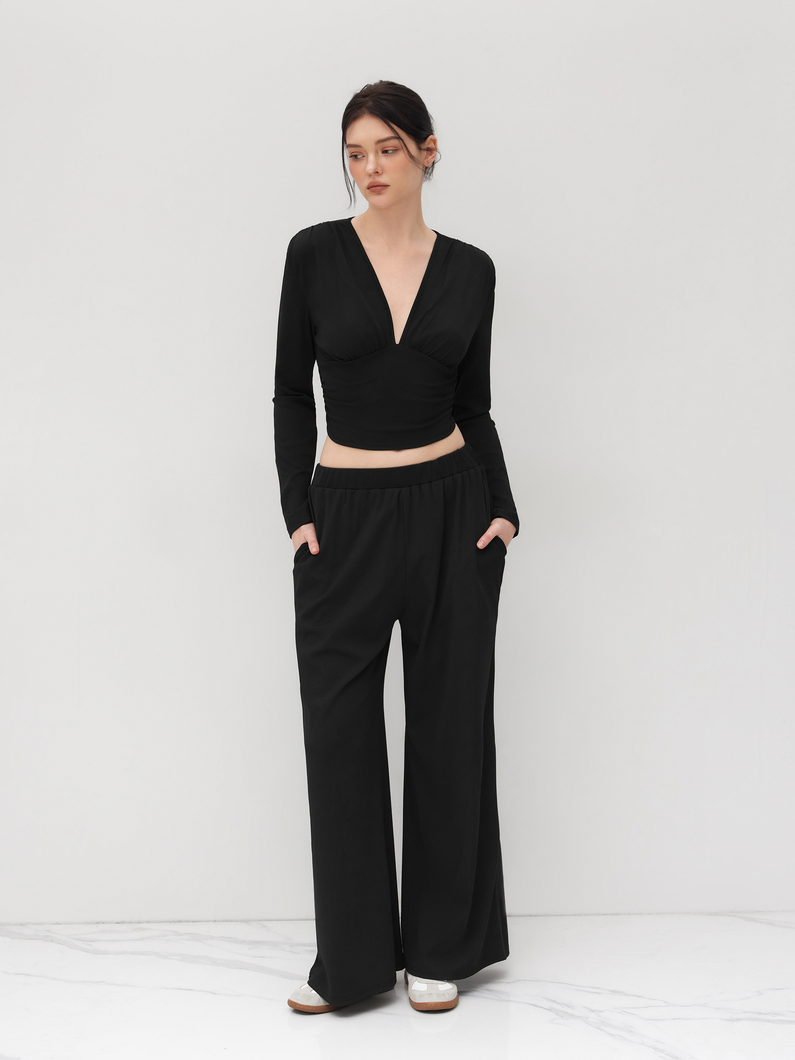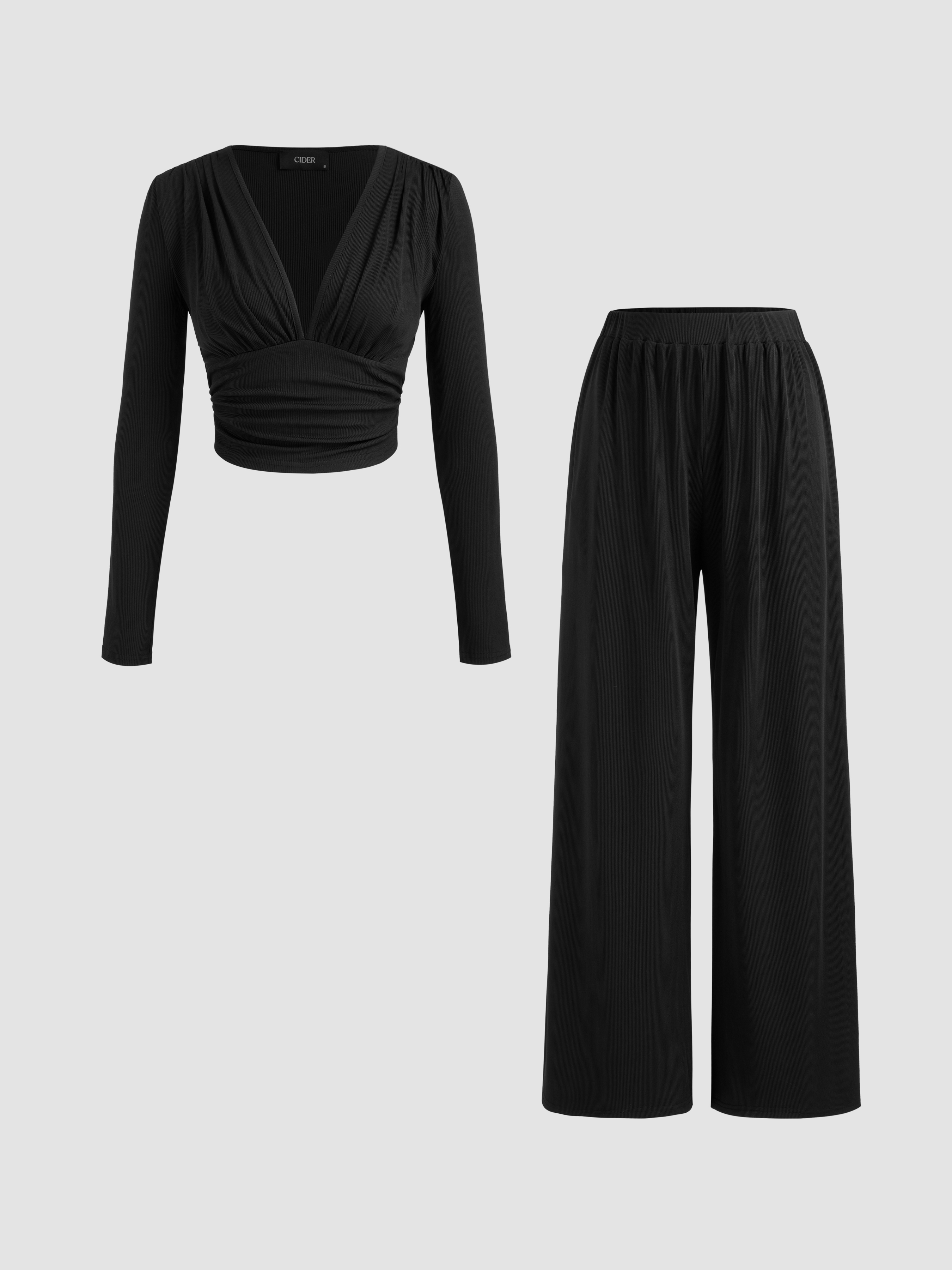 Crop Top con scollo a V e pantaloni a gamba larga a vita media in tinta unita con increspature.