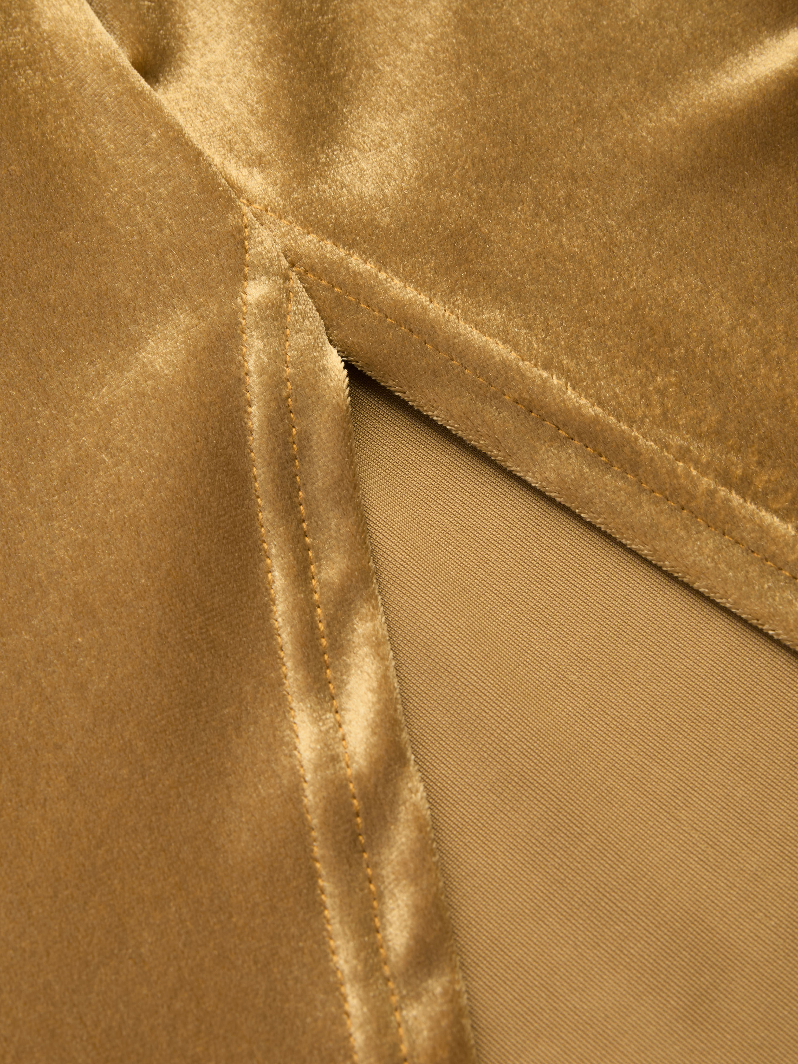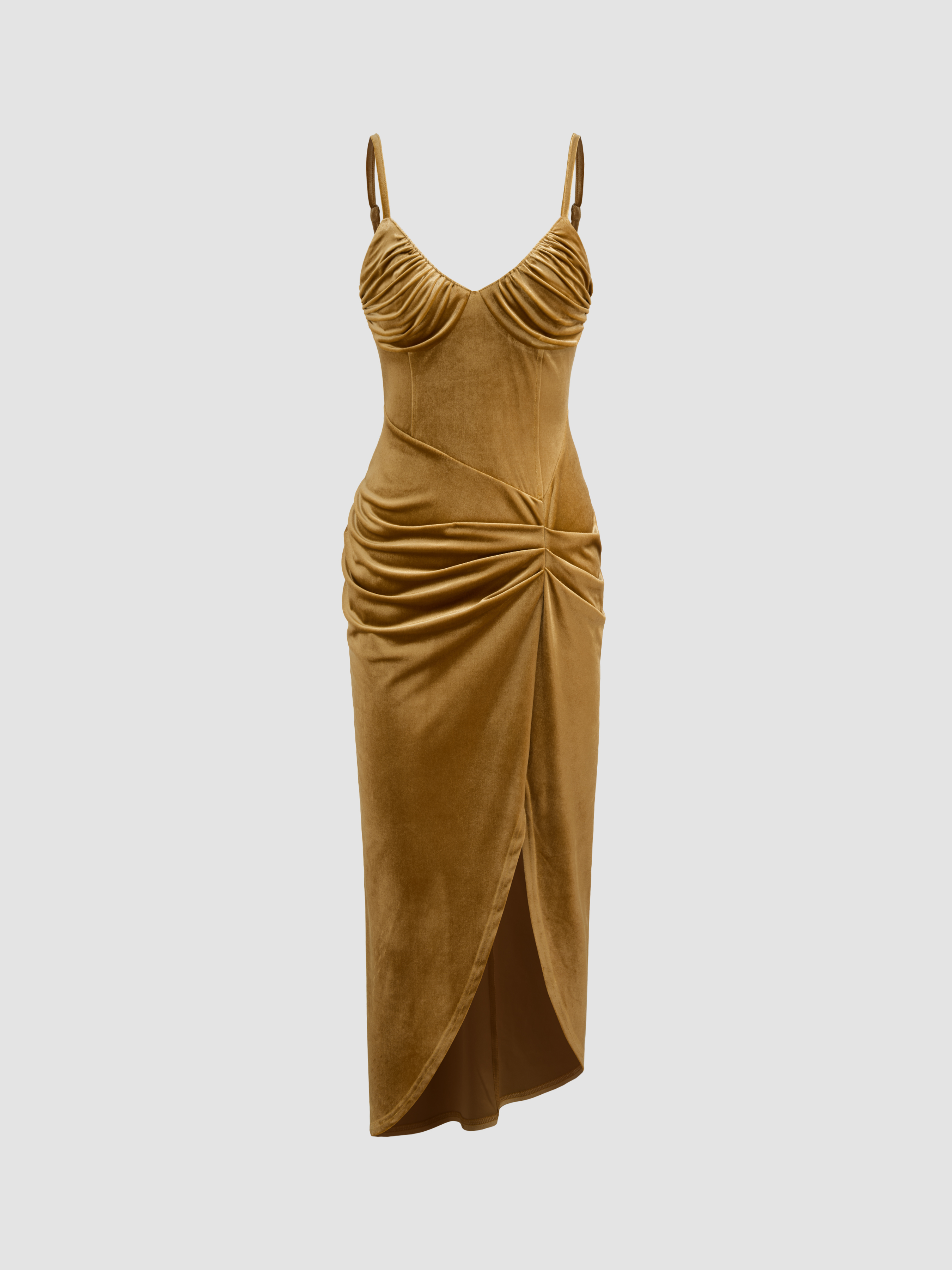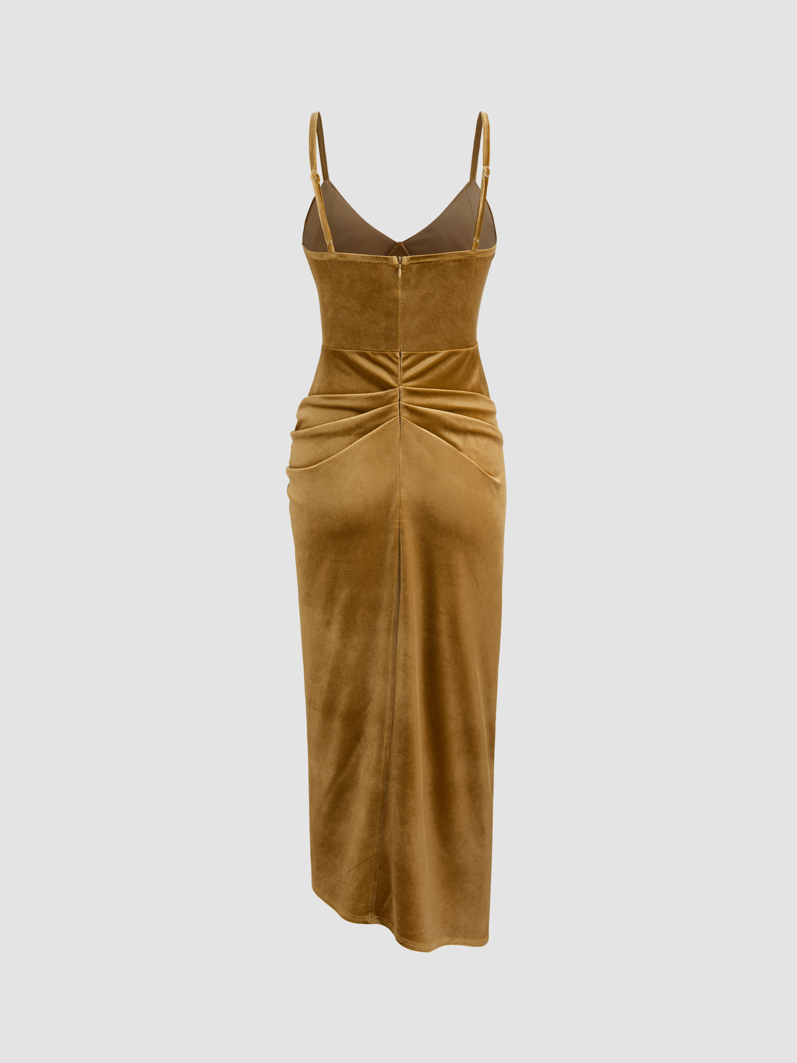 Vestito midi in velluto con scollo a V e spacco solido increspato
