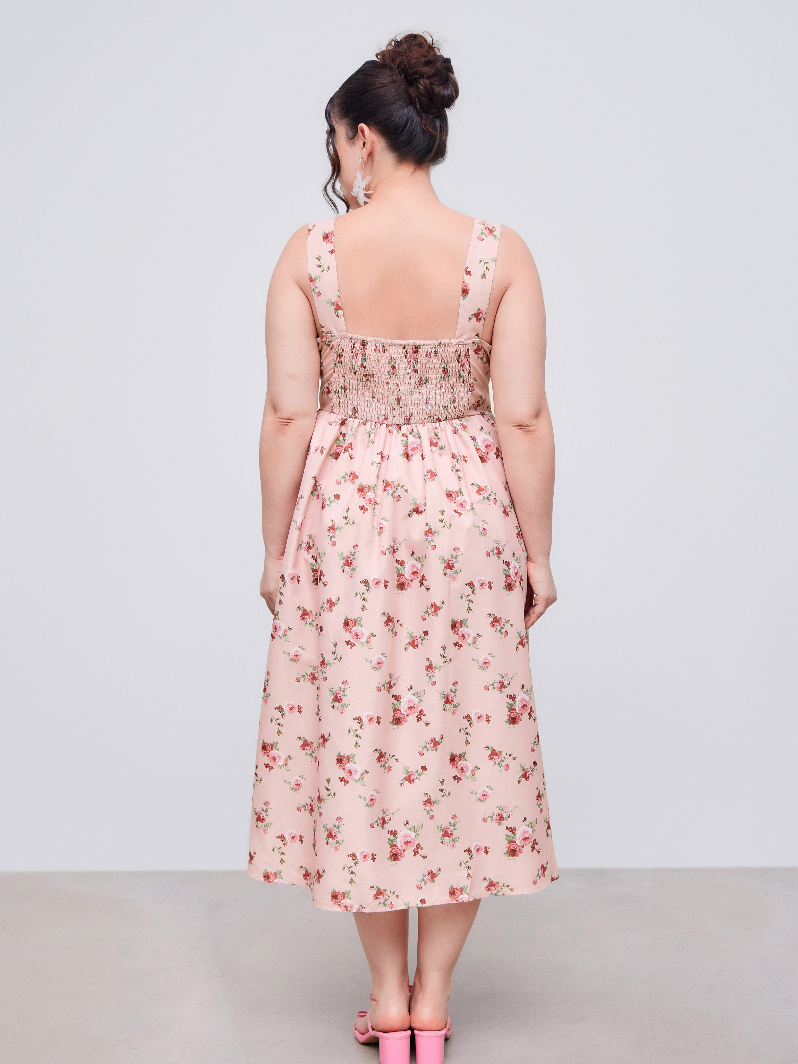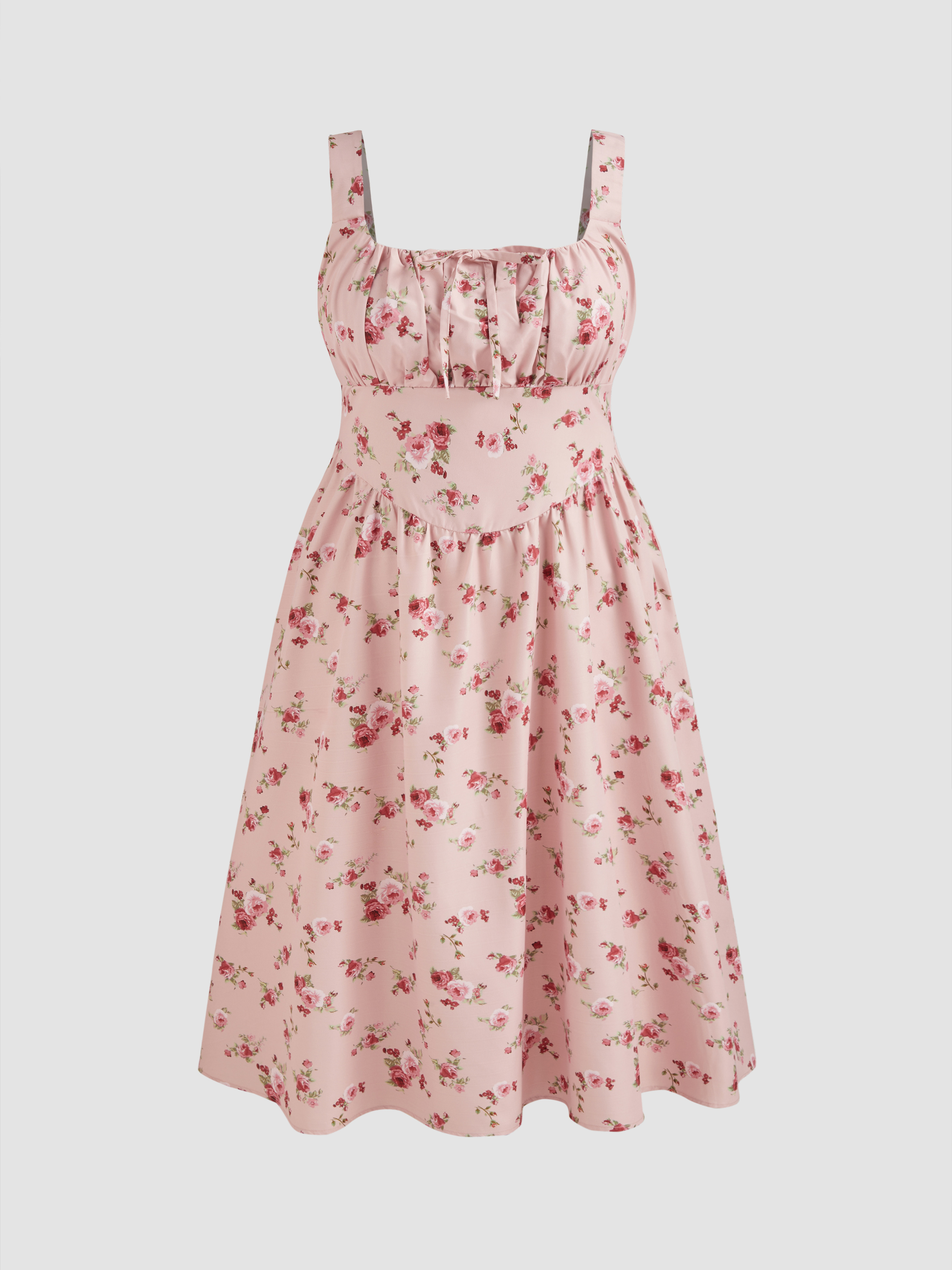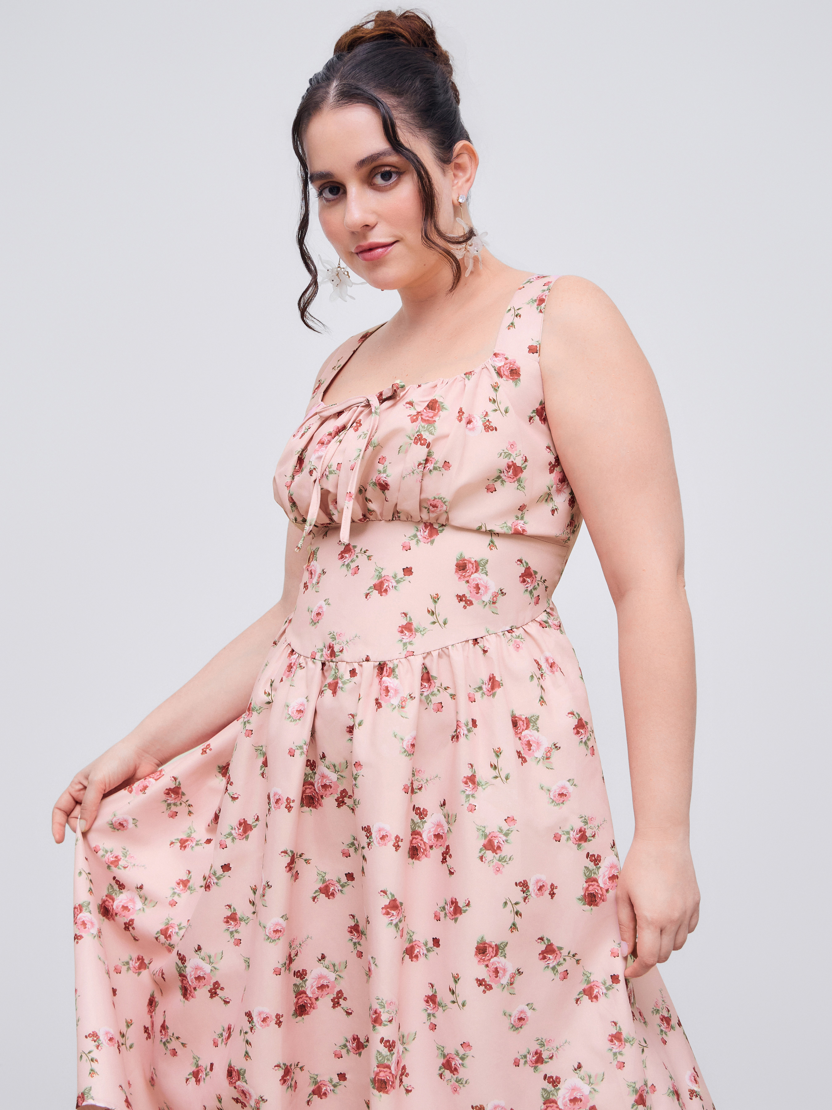 Tessuto con collo quadrato Corsetto floreale annodato con volant Midi Dress Curve & Plus